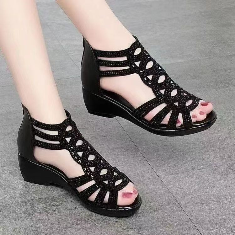 外穿女士坡跟女士凉鞋 美拉德夏新款 时尚 女软底妈妈鞋 软皮罗马凉鞋