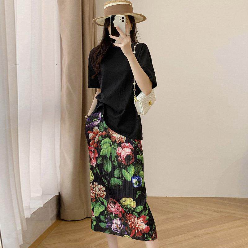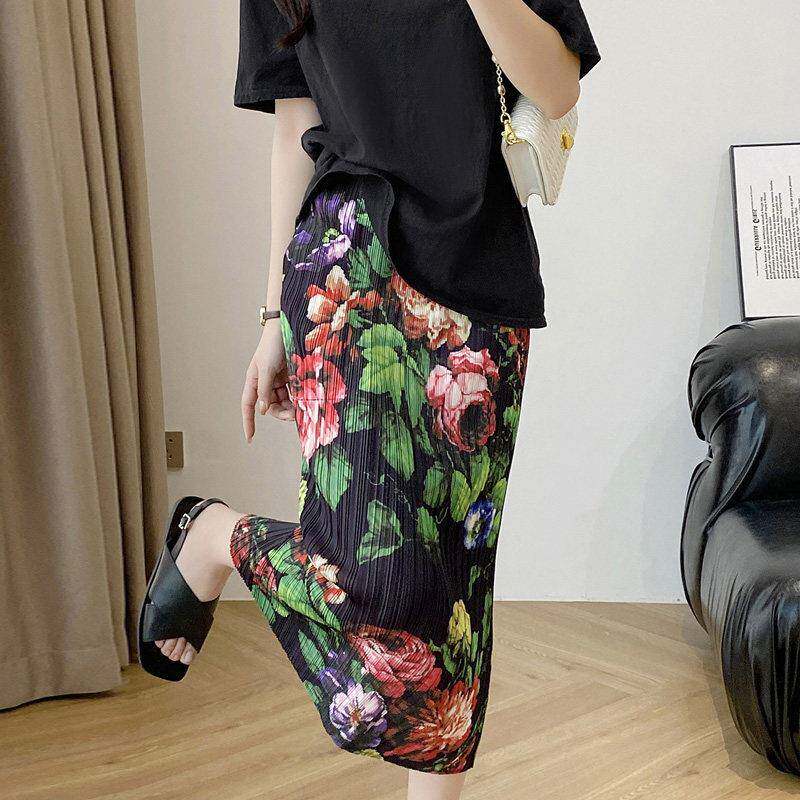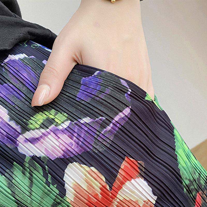 覆古碎花皱褶半身裙女春夏新款 松紧腰口袋黑色显瘦花色休闲0317r