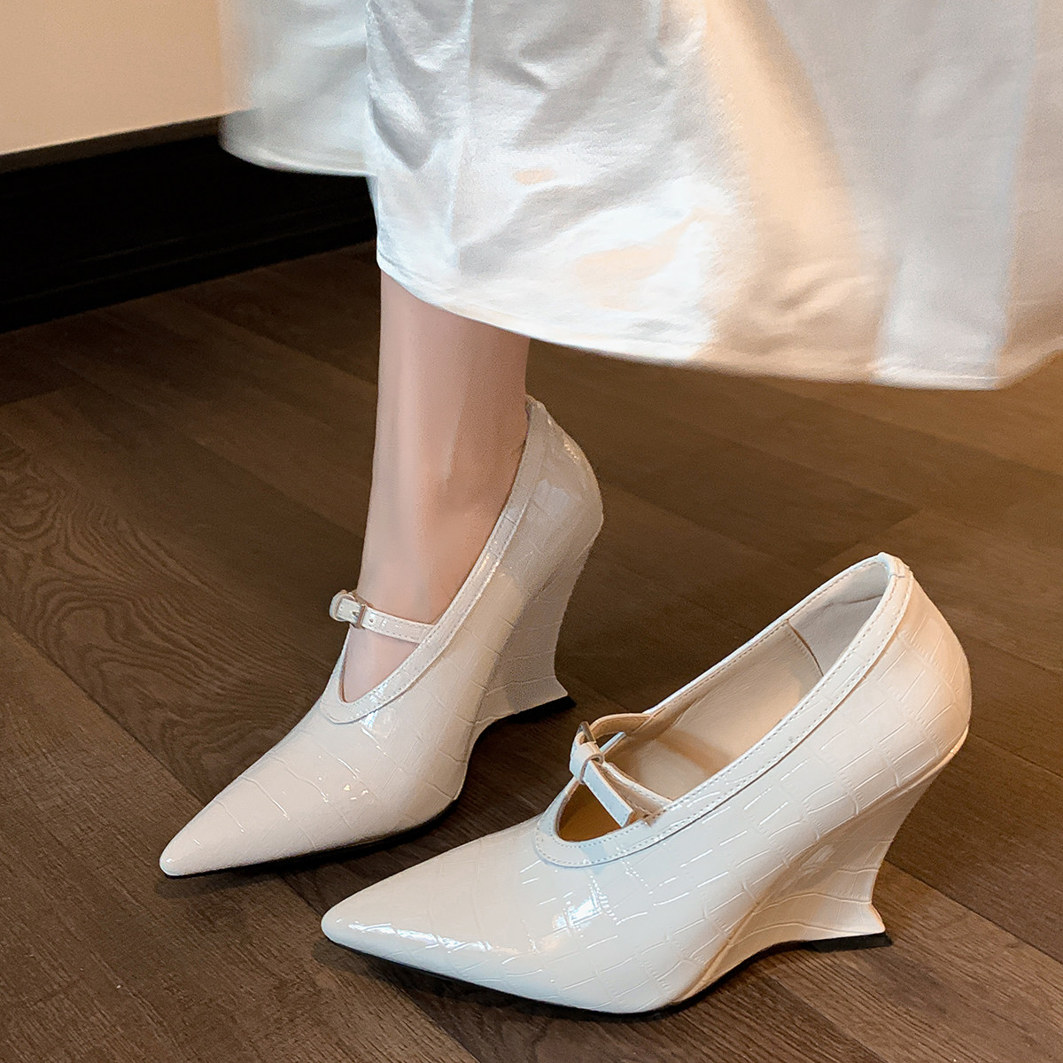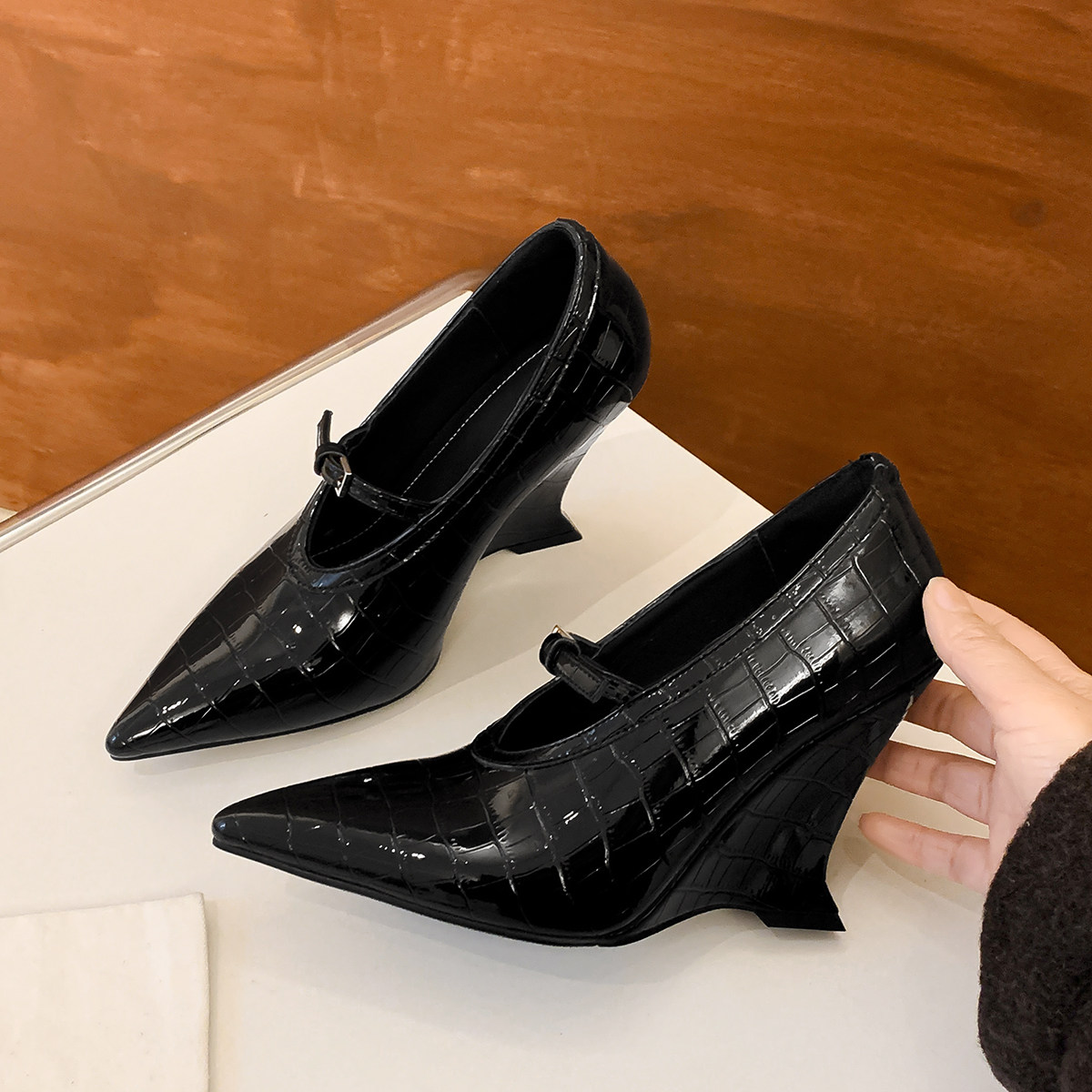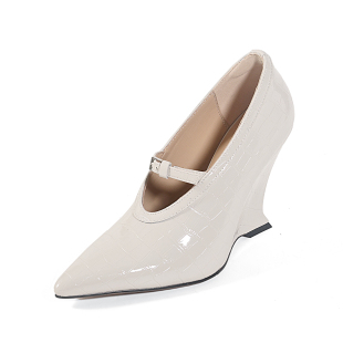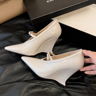 真皮坡跟浅口单鞋 女鞋 尖头四季 职场鞋 宫廷风高跟鞋 OL时尚 复古法式