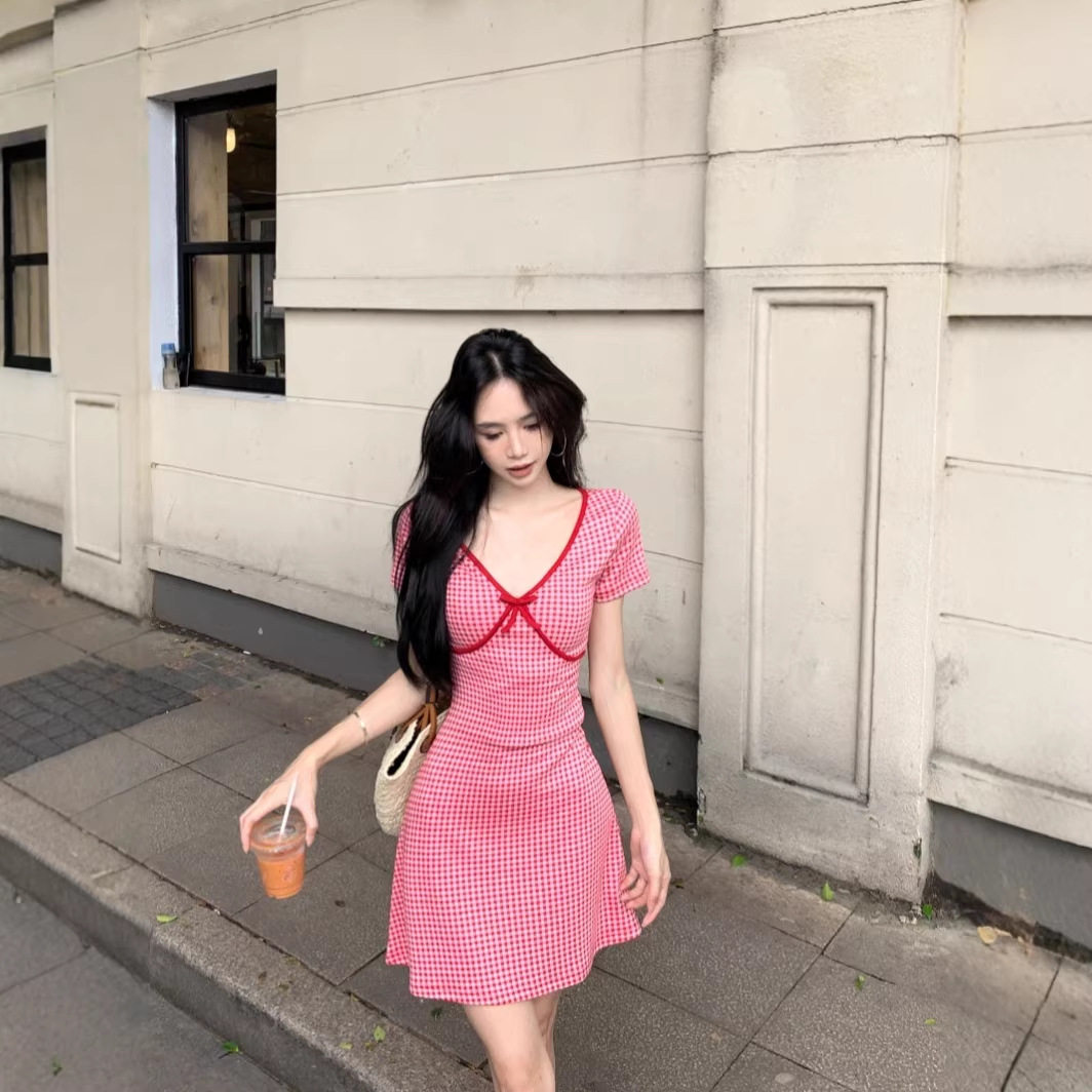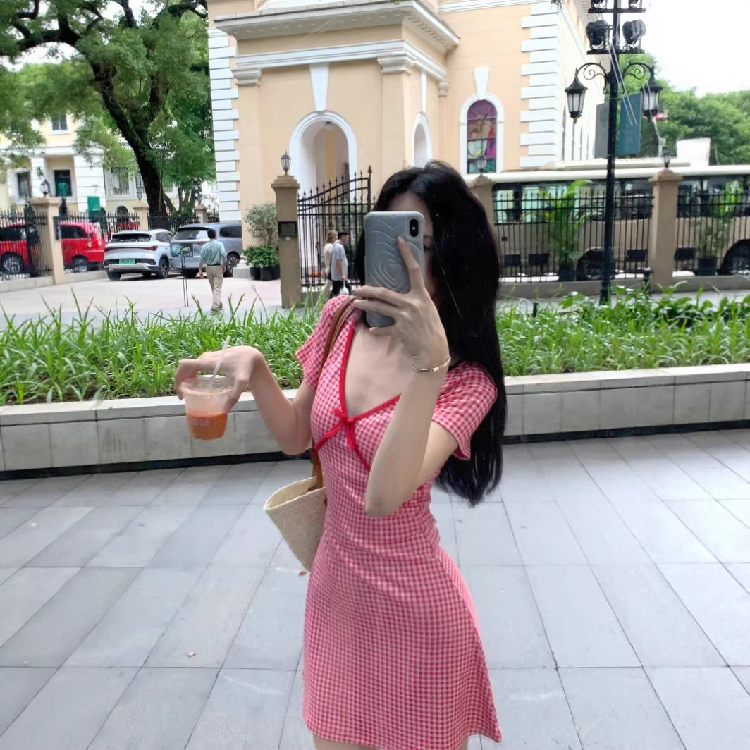 别致辣妹收腰显瘦a字短裙 连衣裙女时尚 夏季 蝴蝶结红色格子V领短袖
