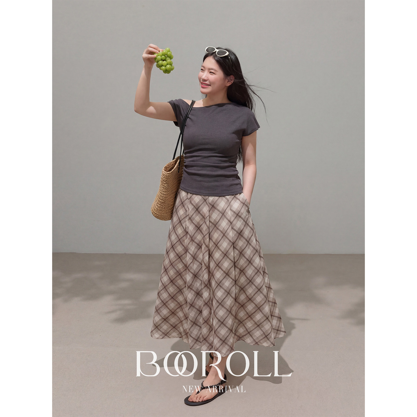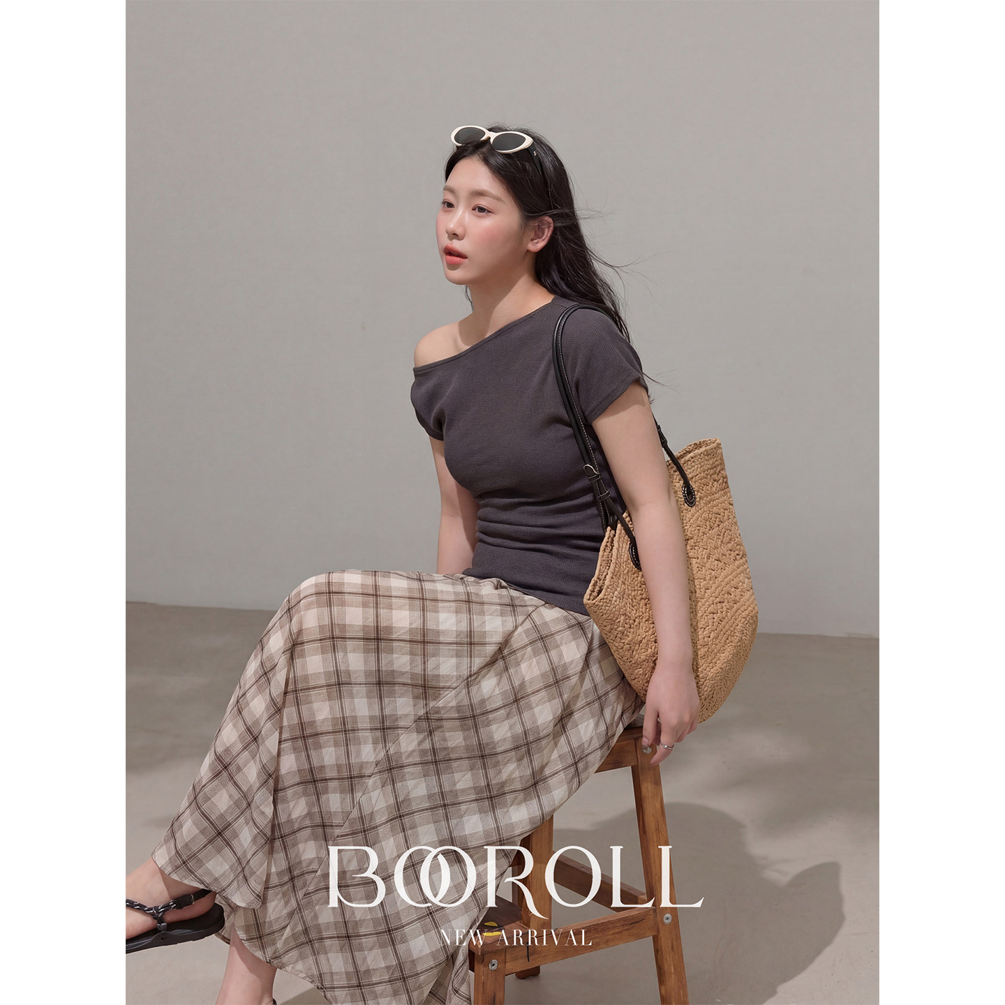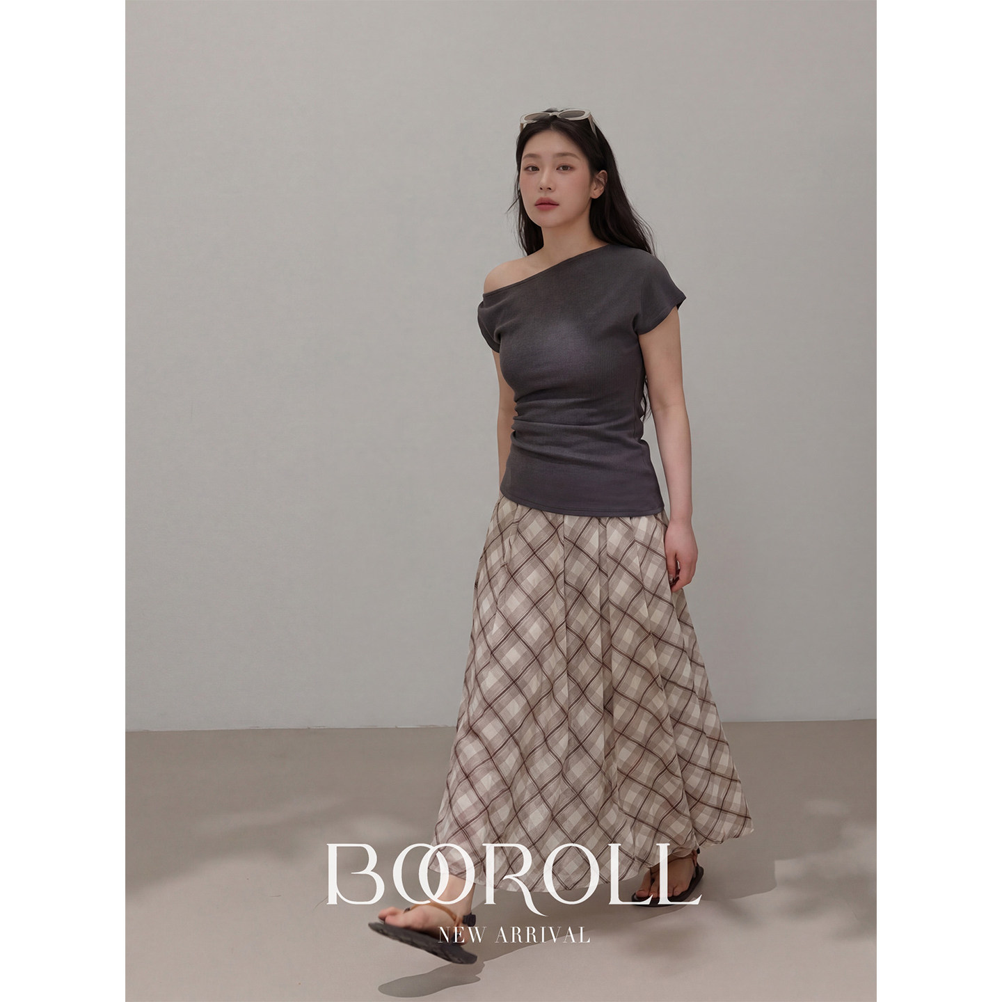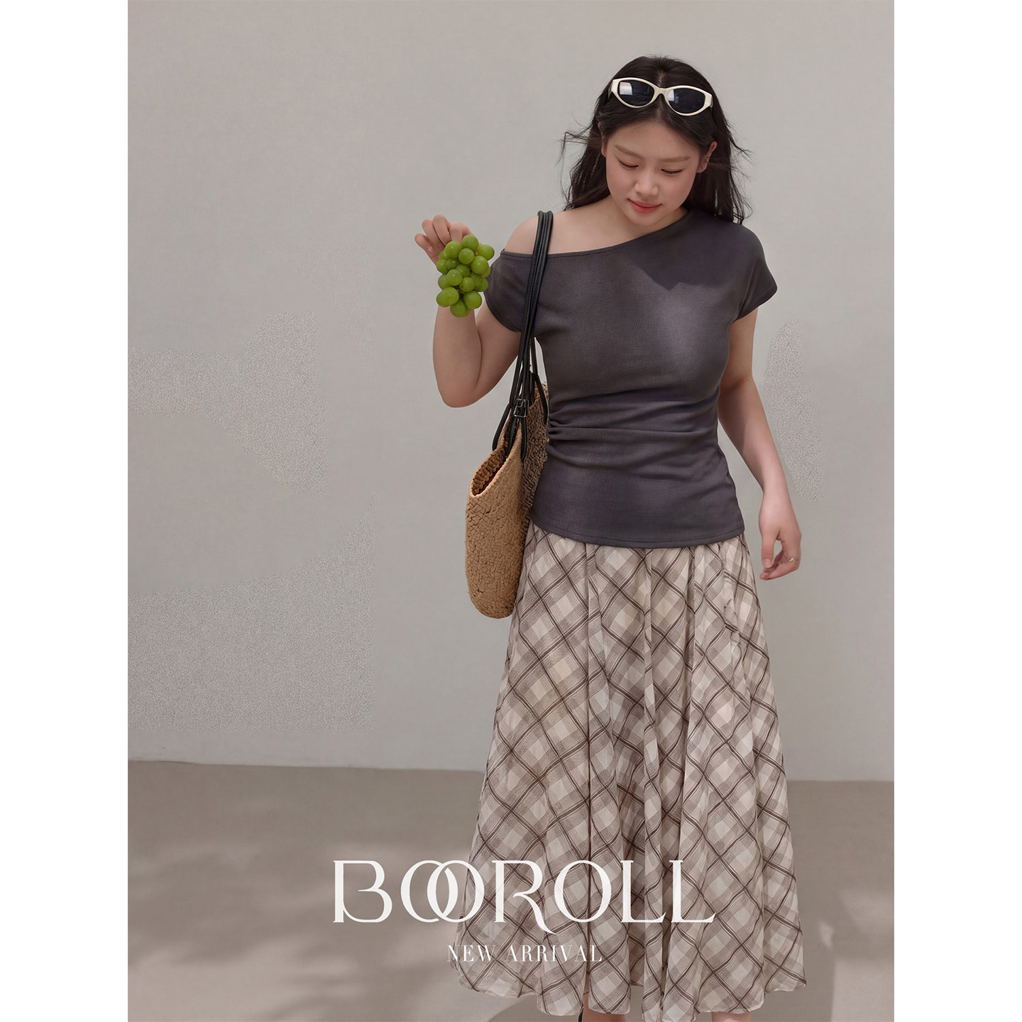 2新品 一件85折满2件75折 T恤格纹半裙 潘不卷 灰色露肩短袖