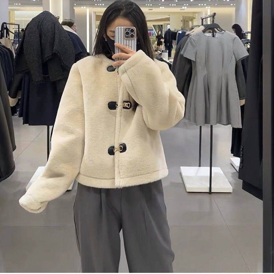 6318286 甜美气质皮草效果绳结扣双面毛绒夹克外套 秋冬新款 女装