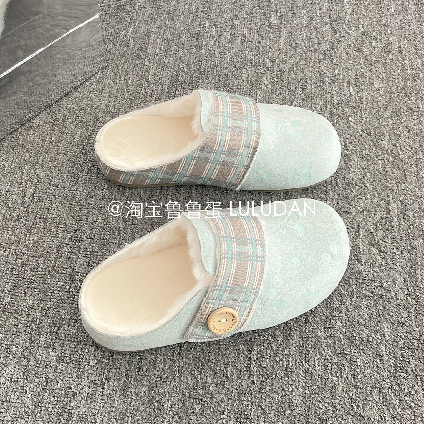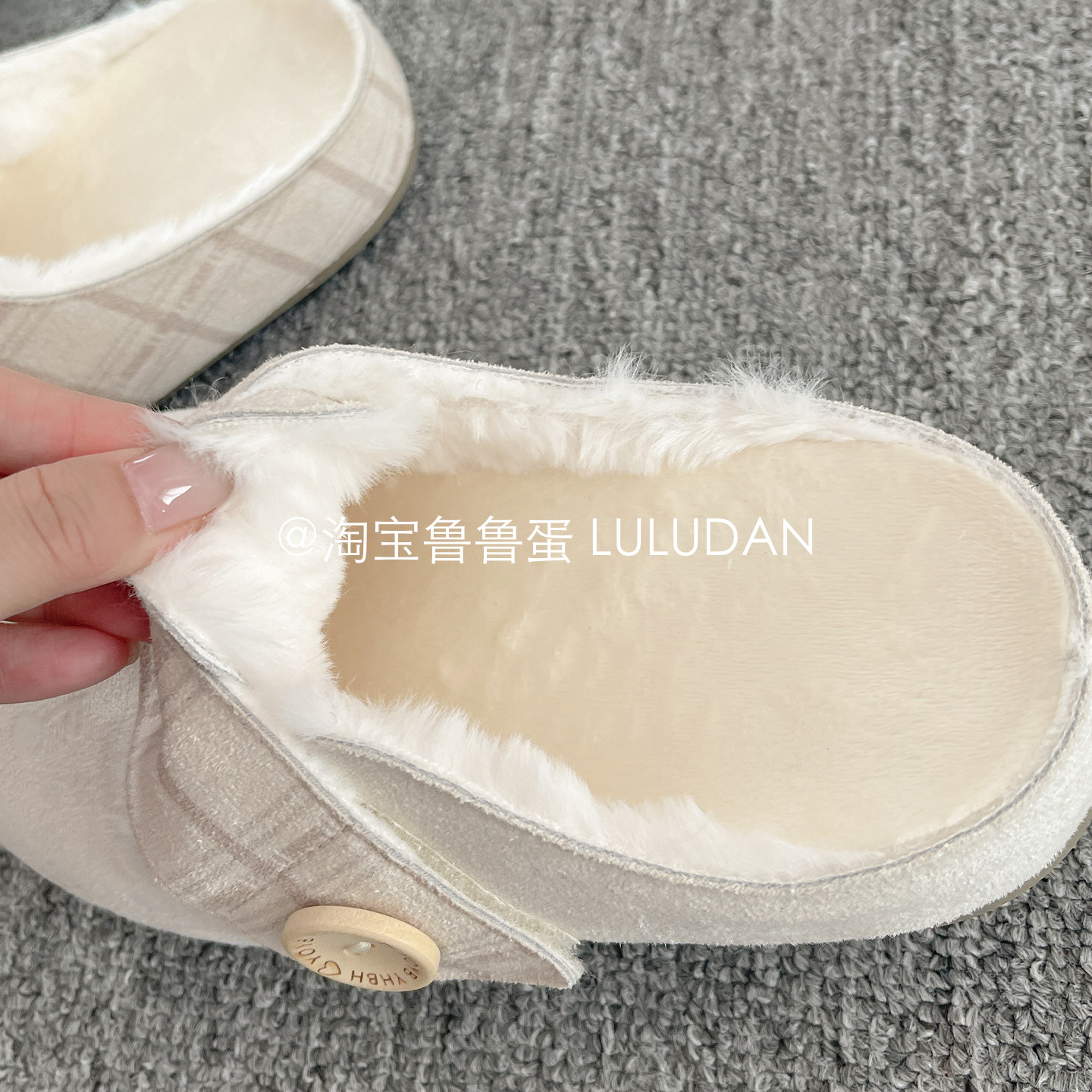 网红室内居家防滑软底毛绒包头棉拖 时尚 纽扣毛毛拖鞋 女外穿秋冬季