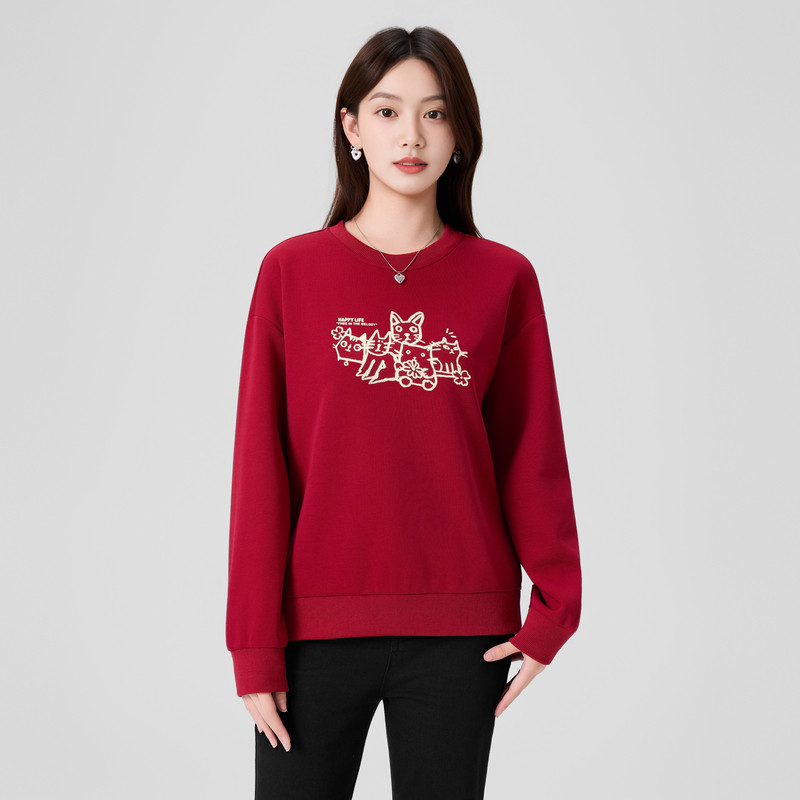 百搭长袖 休闲时尚 加绒保暖上衣 新款 快鱼印花圆领卫衣女2025年冬季