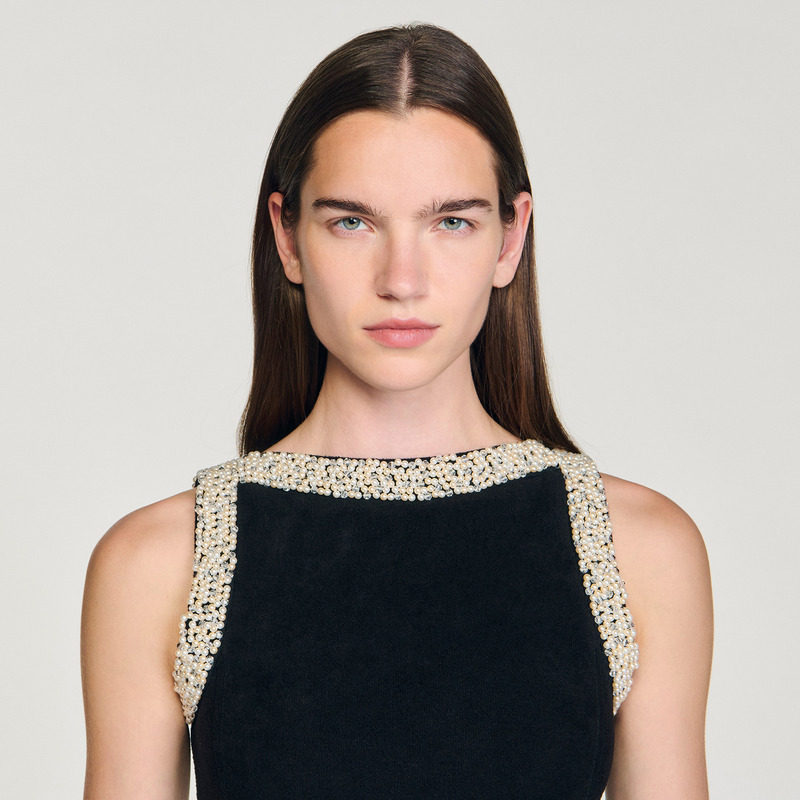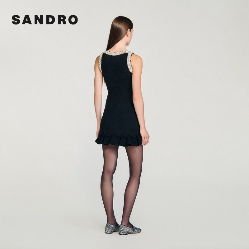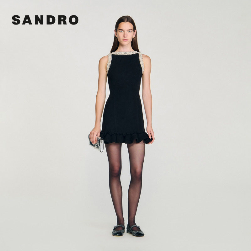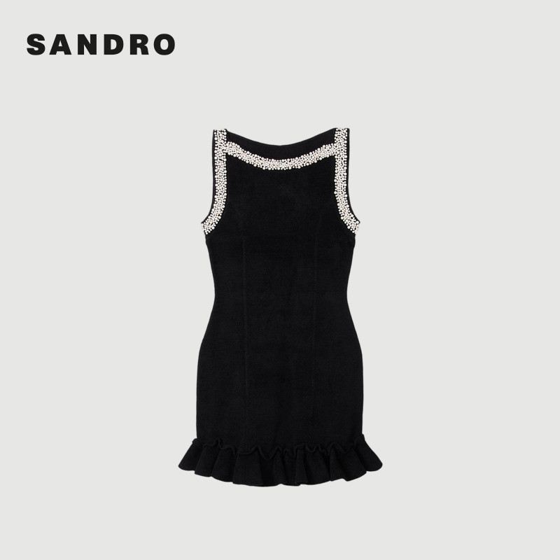黑色仿珠饰荷叶边下摆针织连衣裙 法式 季 末6折SANDRO2025秋冬女装