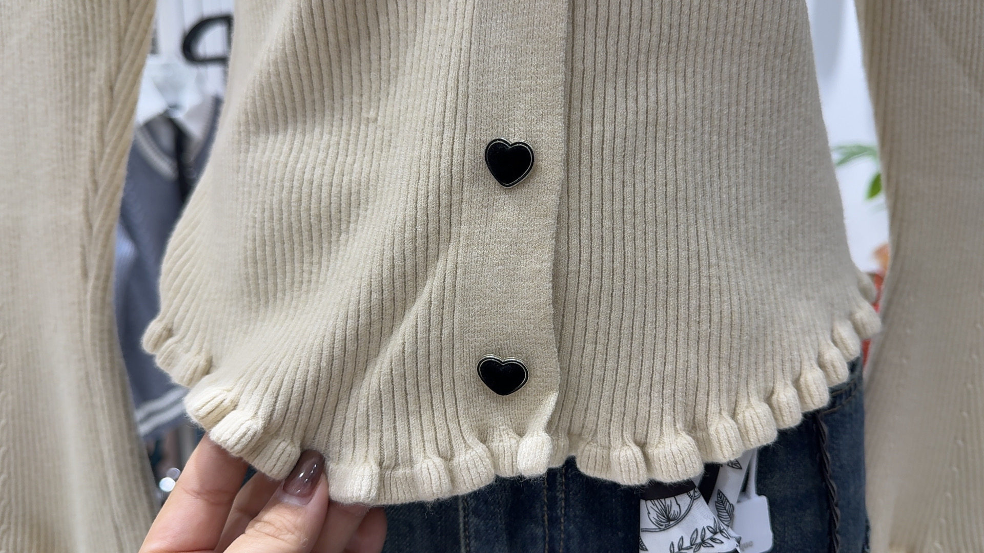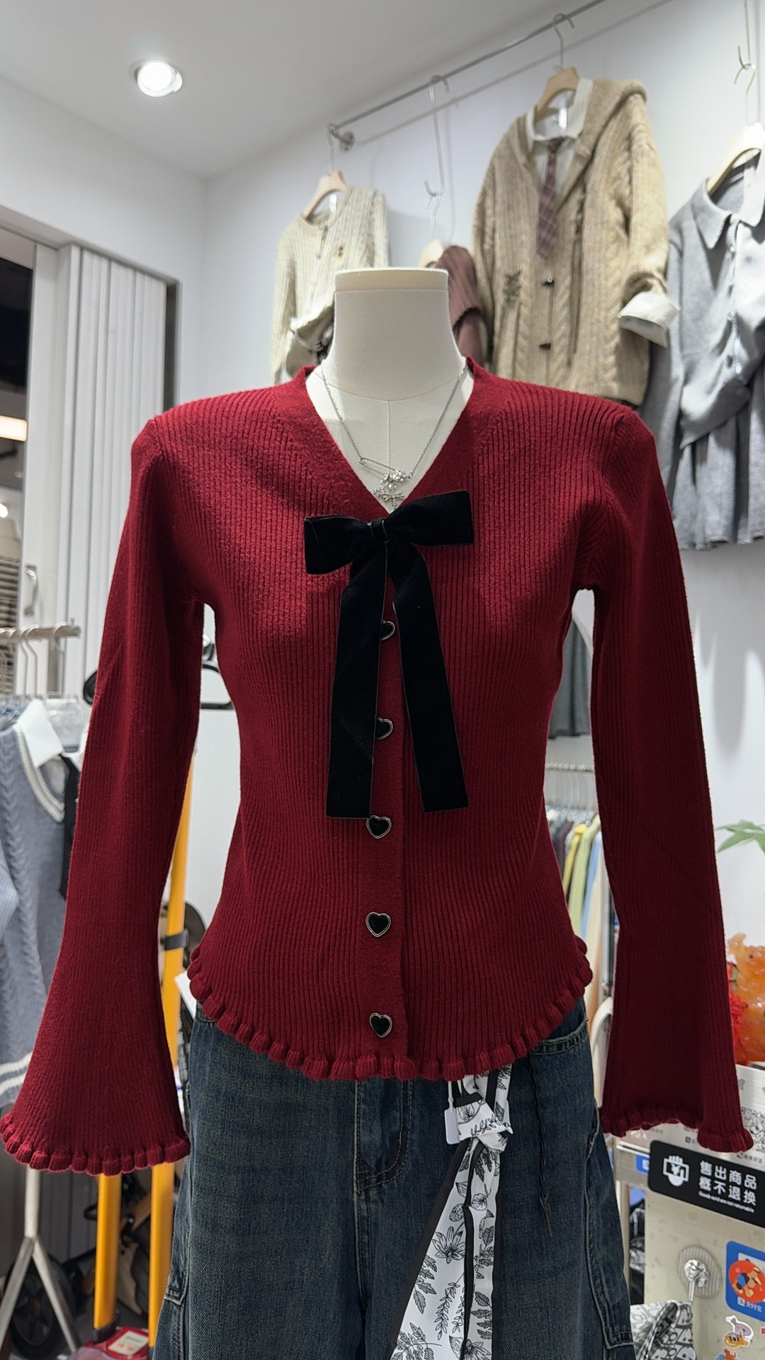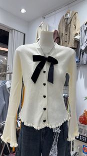 2025秋冬韩系高级感v领蝴蝶结针织辣妹开衫 上衣女显瘦木耳边毛衣