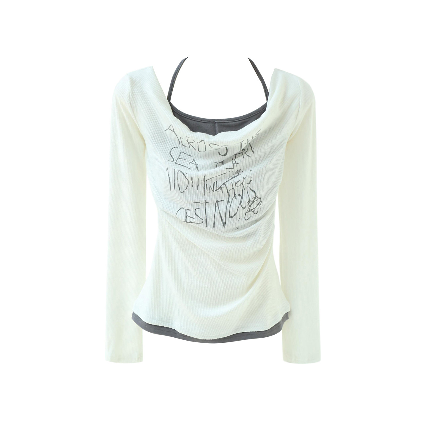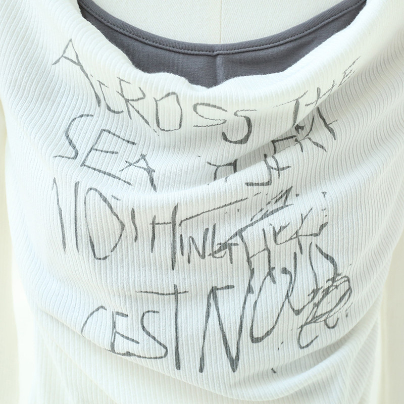 复古辣妹假两件字母印花挂脖荡领长袖 拾野森 美式 新款 上衣 春装
