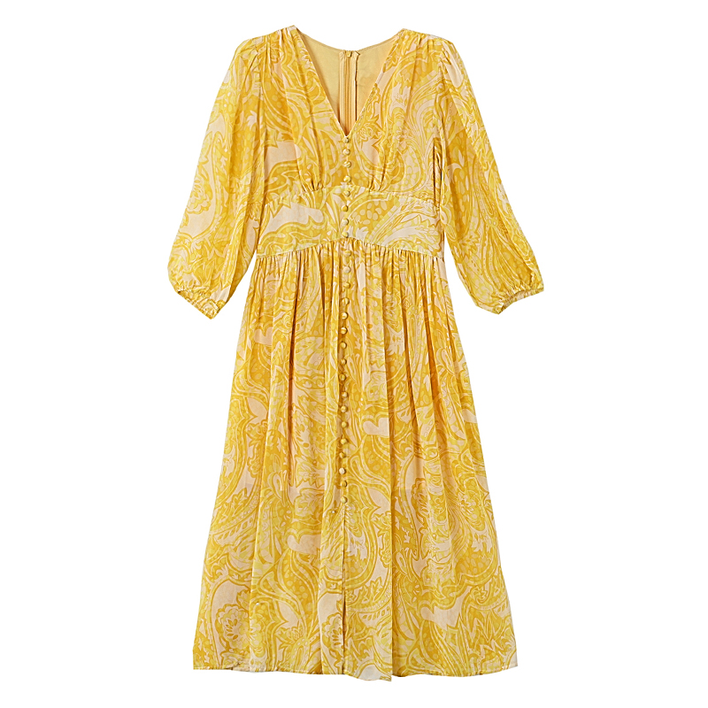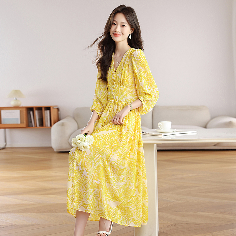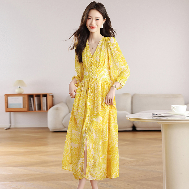 新款 连衣裙女2025秋季 天丝雪纺茶歇长裙 气质超仙V领碎花长袖 法式