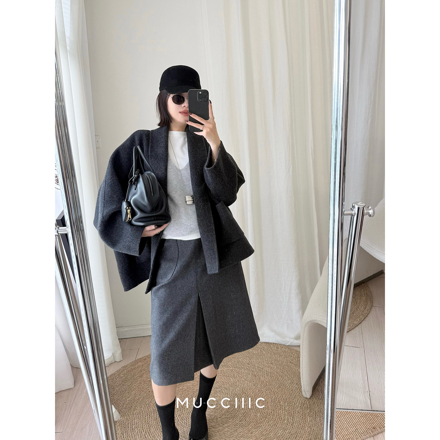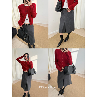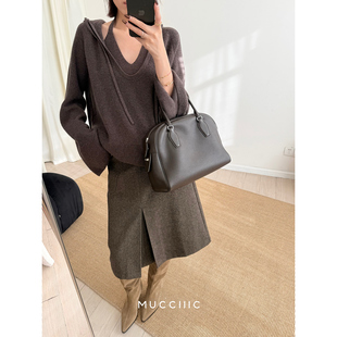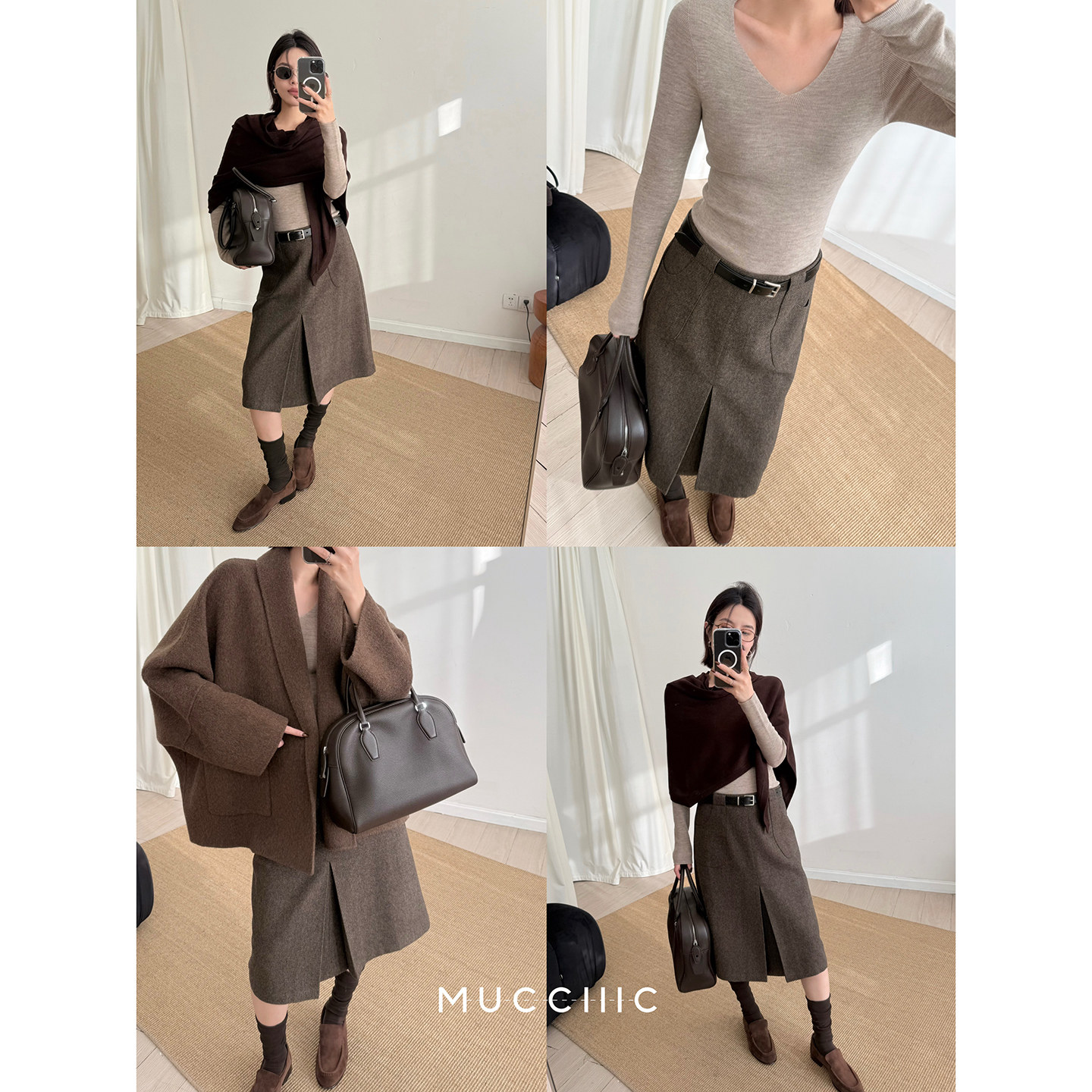 MUCCHIC 配真皮皮带 老钱羊毛贴袋百褶半裙直筒裙秋冬显瘦穿搭