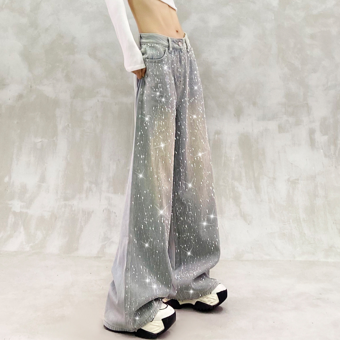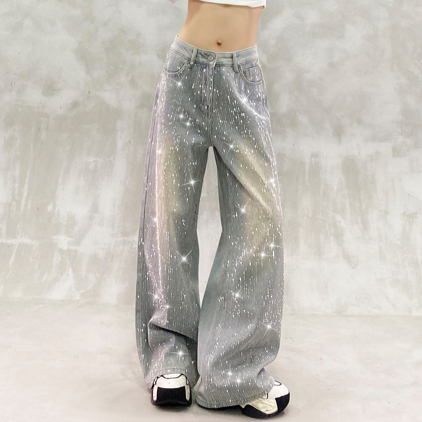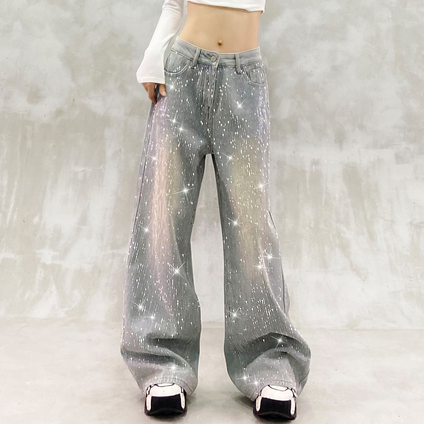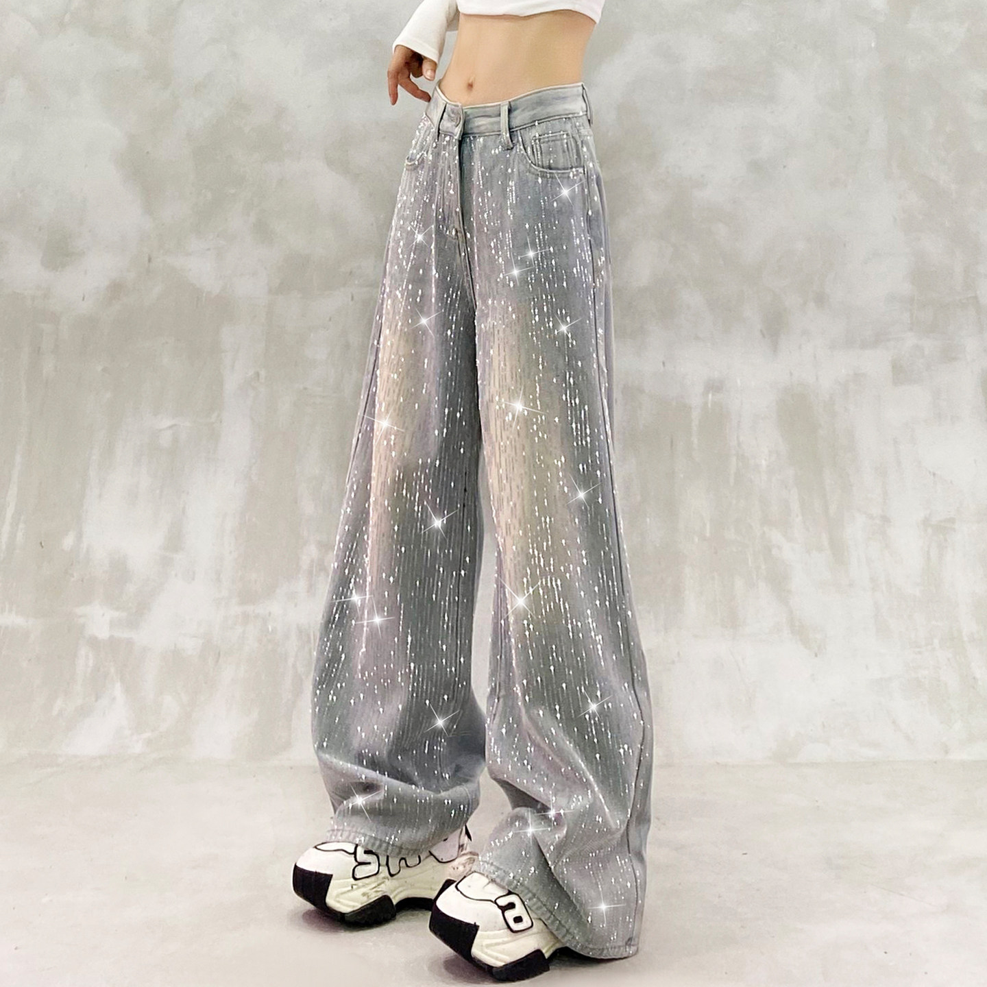 高腰宽松显瘦百搭直筒阔腿裤 女冬新款 饰加绒牛仔裤 重工闪亮烫钻装