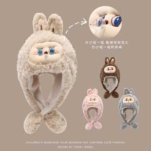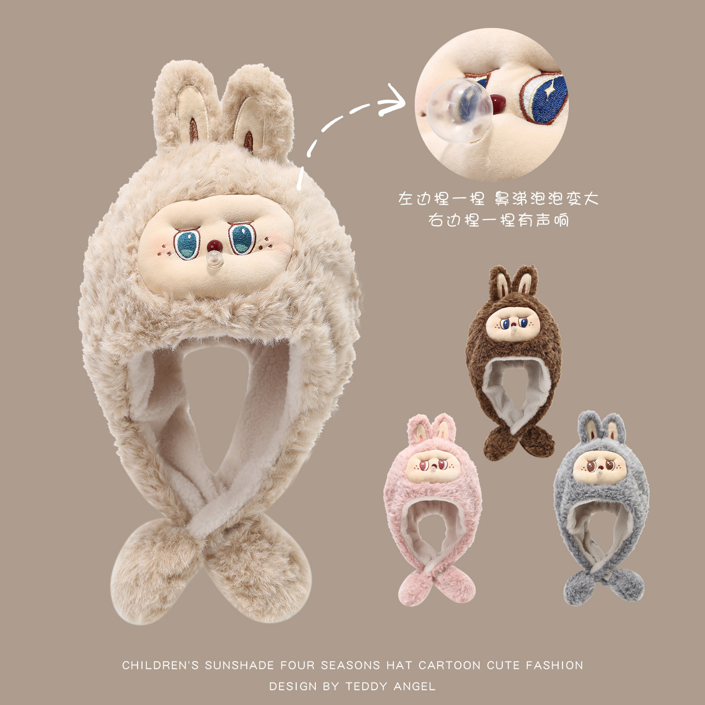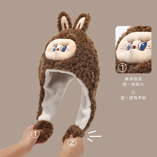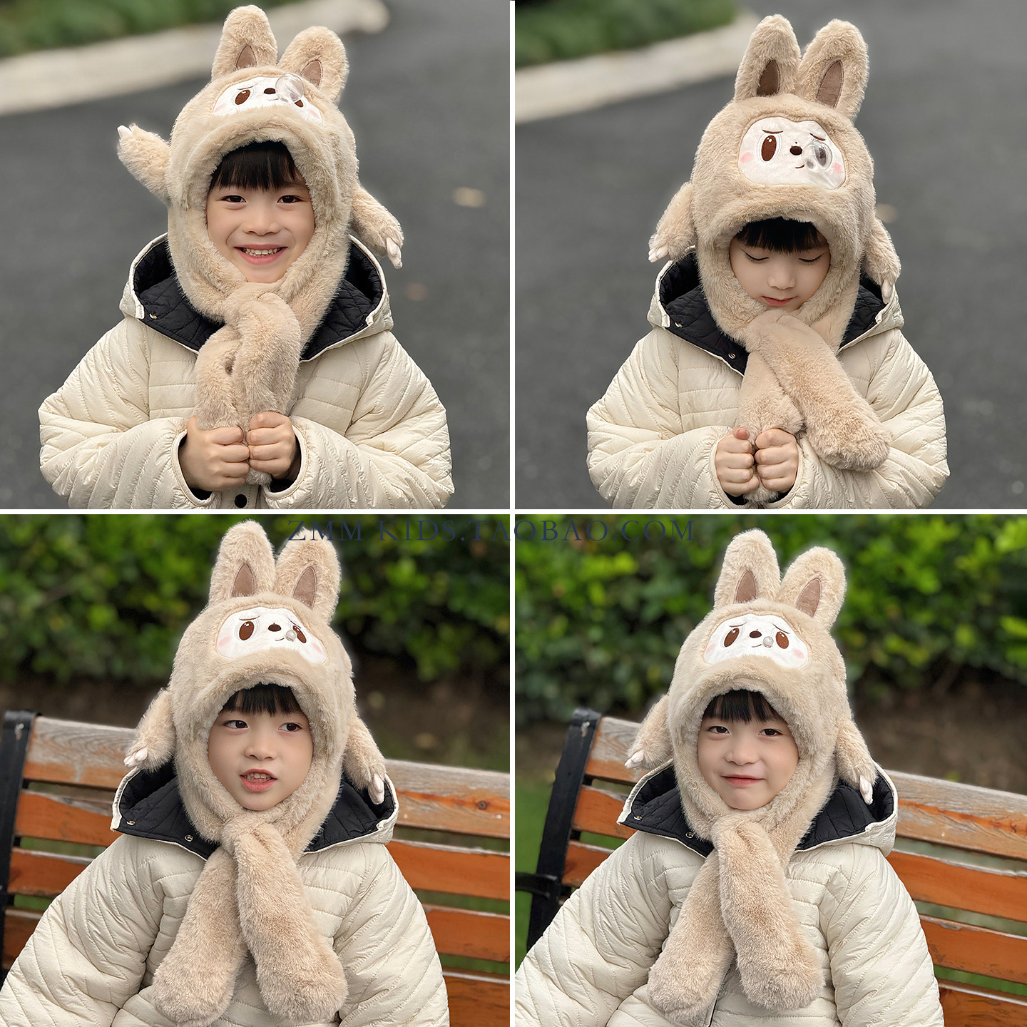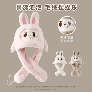 儿童帽子围巾一体女孩冬男labubu拉布布吐吹泡泡捏耳朵会动 围脖