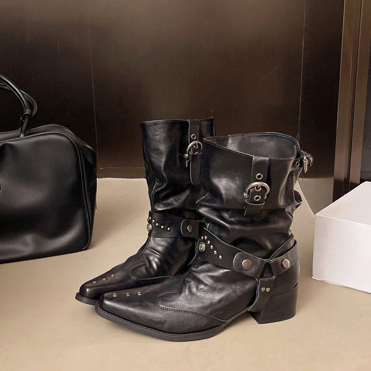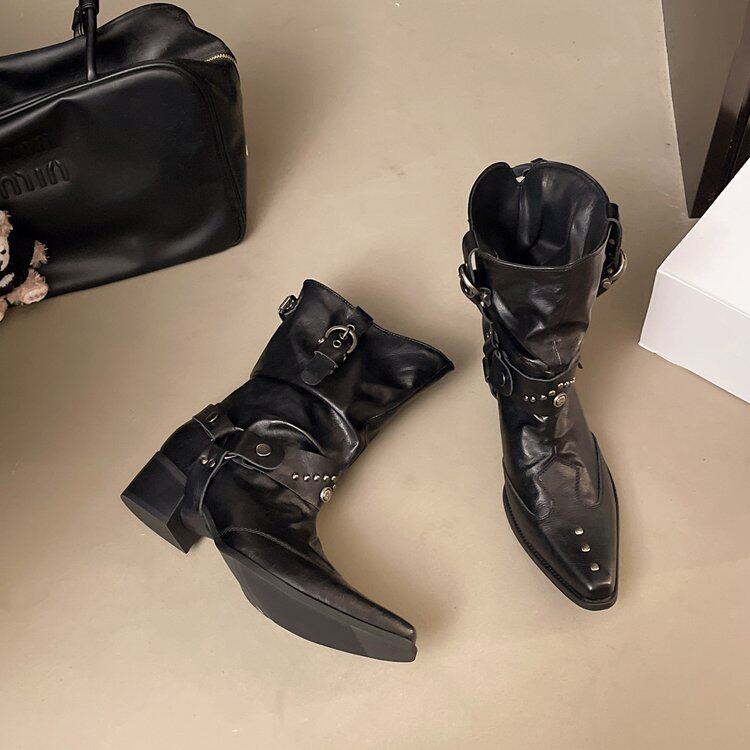 2025超火短靴尖头粗跟铆钉堆堆靴西部牛仔时装 靴子 靴女英伦风个性