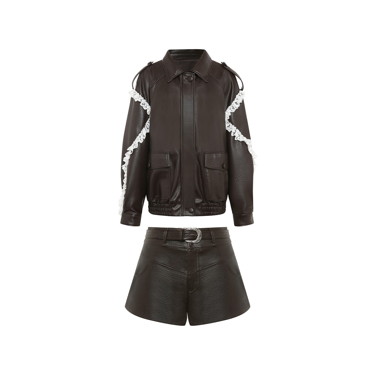 Wester 套装 2025秋季 甜酷风蕾丝镶边棕色皮外套短裤 女 新款 Maison
