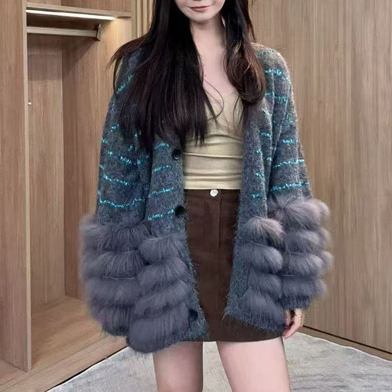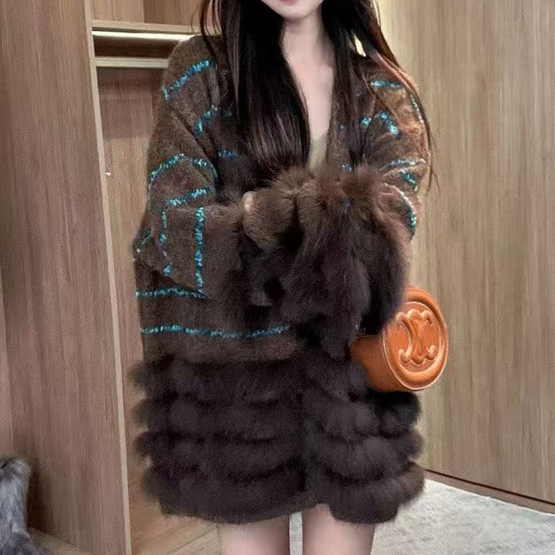 毛绒外 女秋冬高级感宽松中长款 25秋冬新款 小香风皮草拼接针织开衫