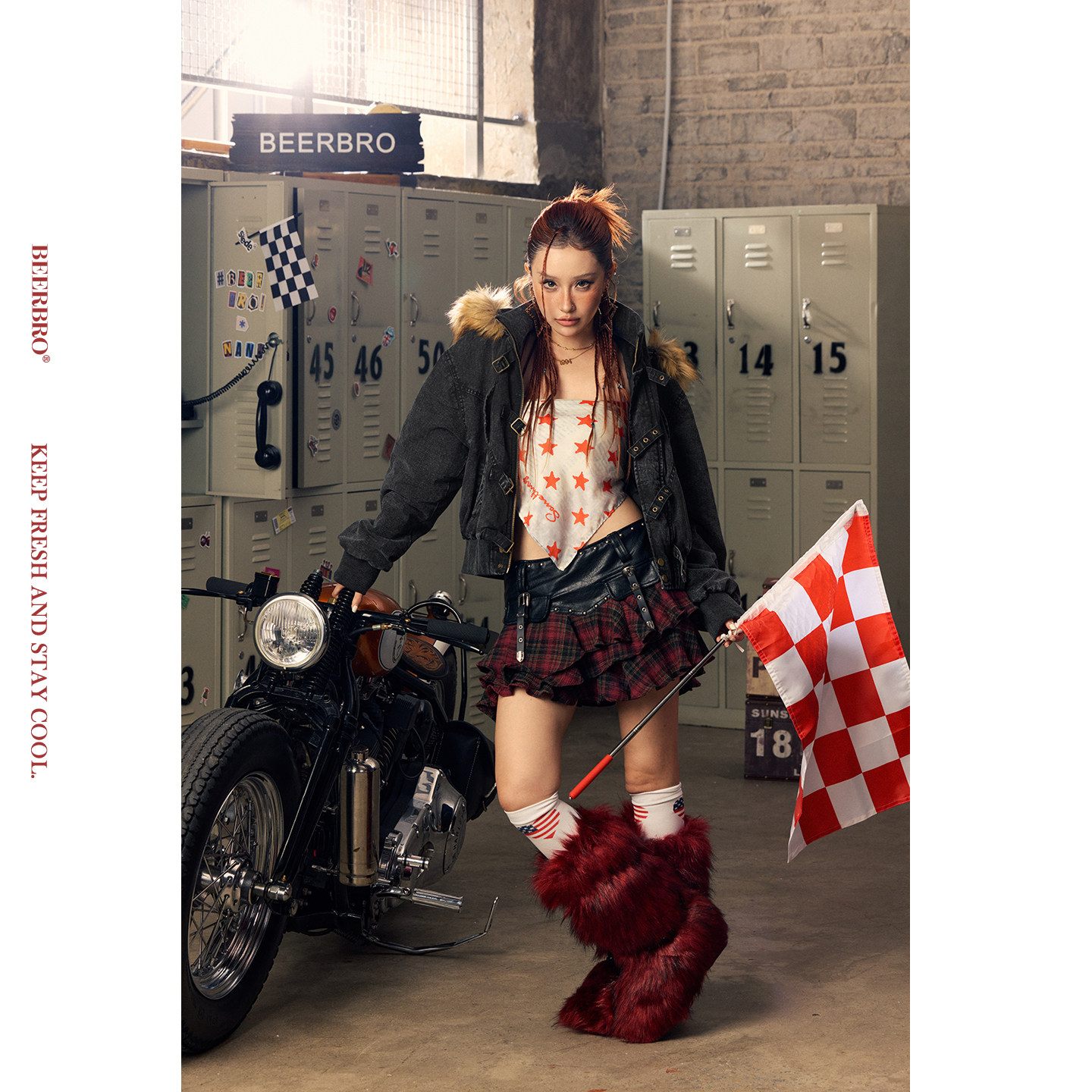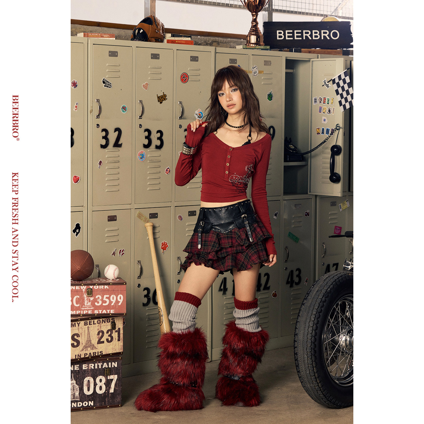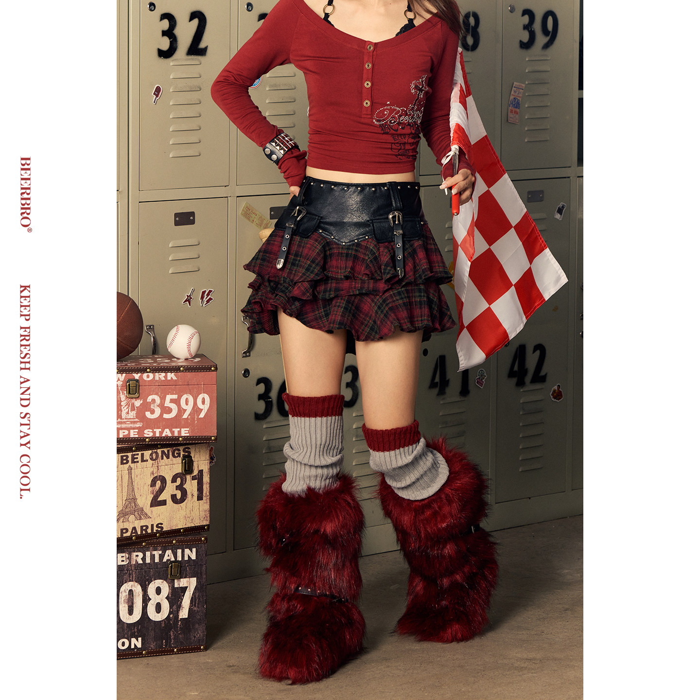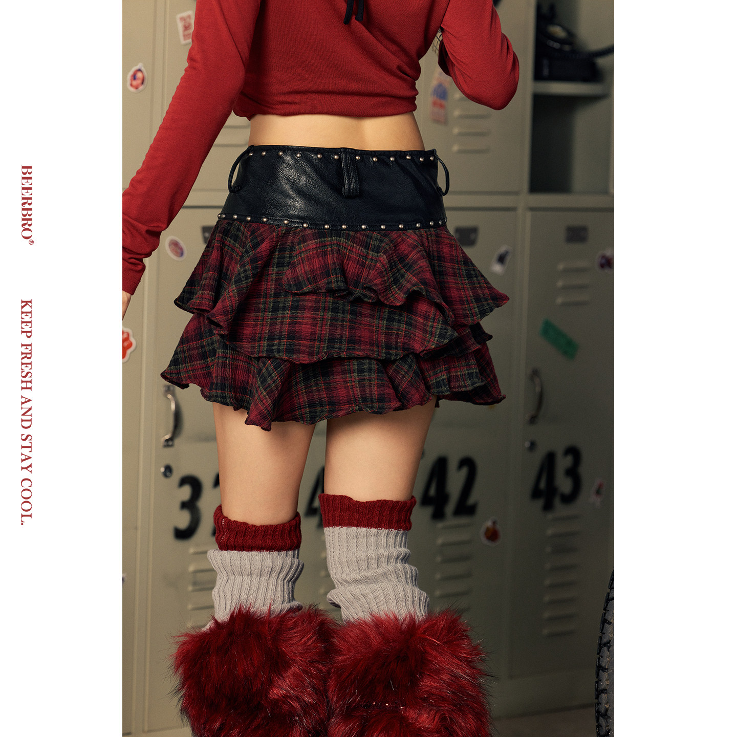 辣妹红格纹不规则荷叶边pu拼接短裙半身裙 MOTO BeerBro CITY