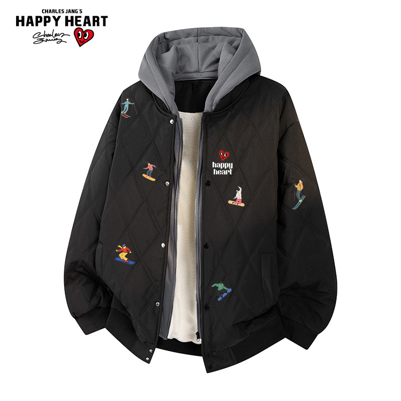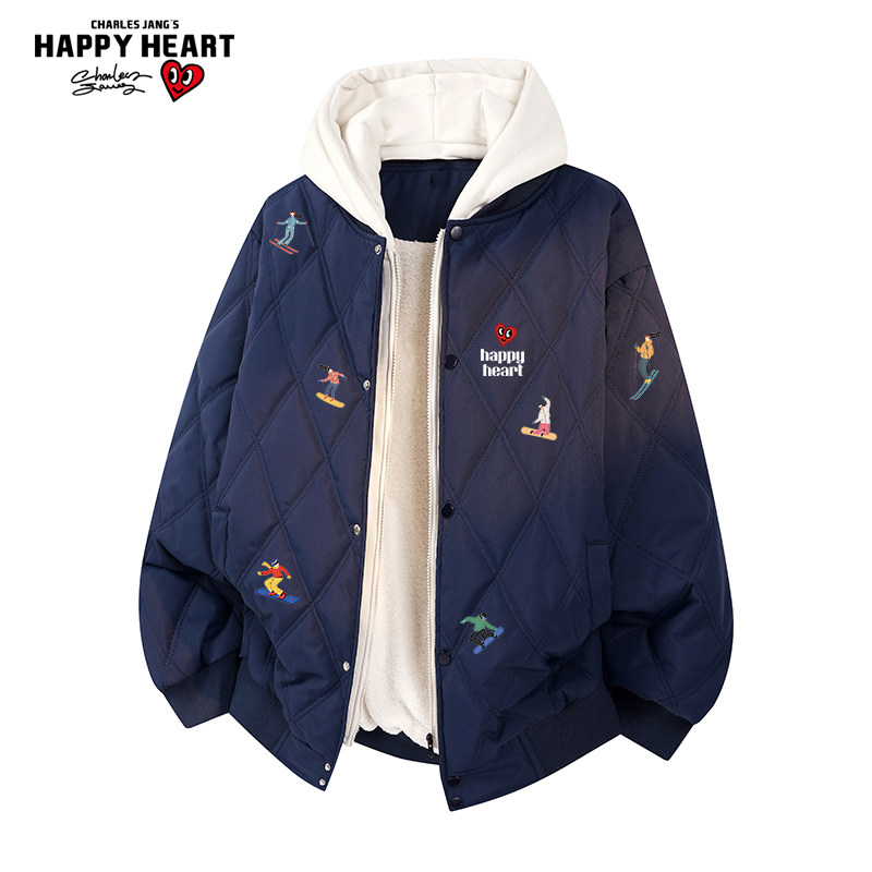 查尔斯桃心美式 撞色假两件加厚保暖情侣外套 滑雪人印花棉服男冬季