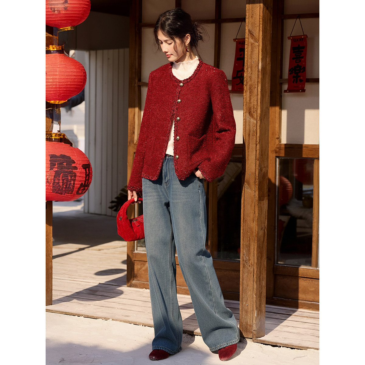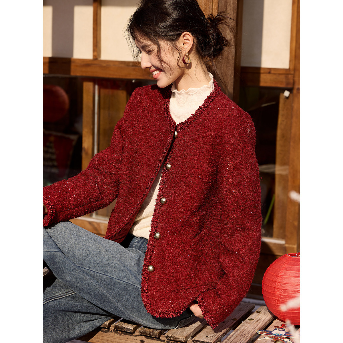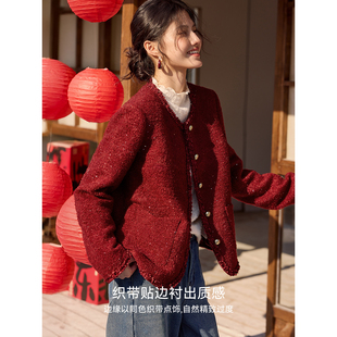 XWI欣未含羊毛亮片粗花呢小香风外套女2026春季 新年战袍红色上衣