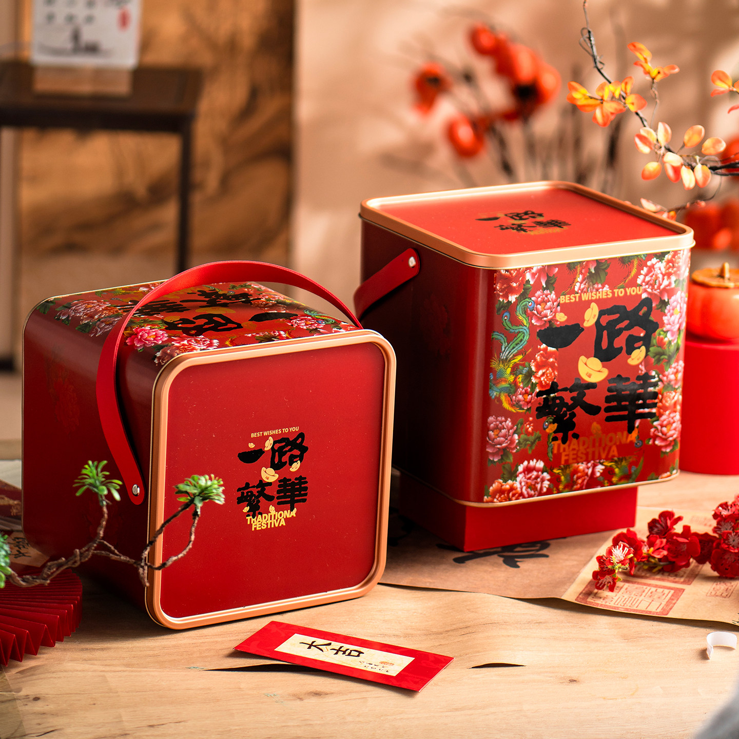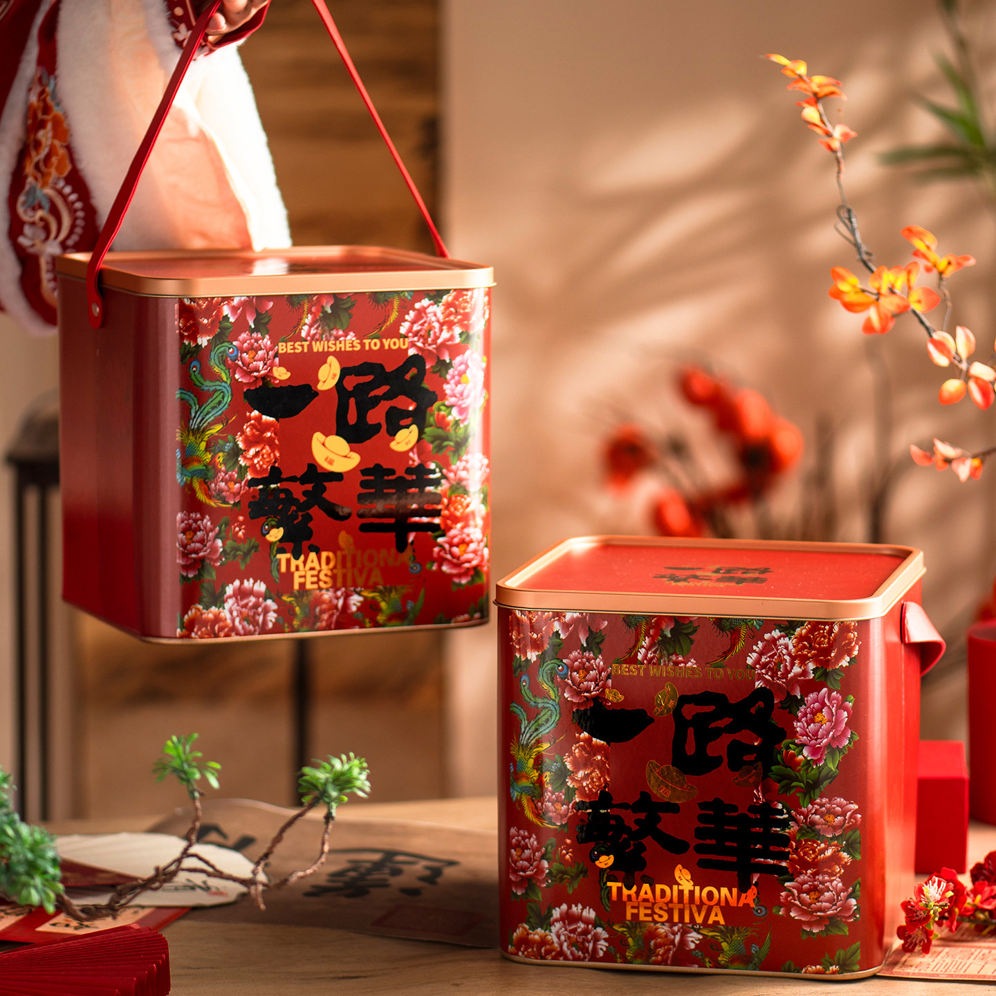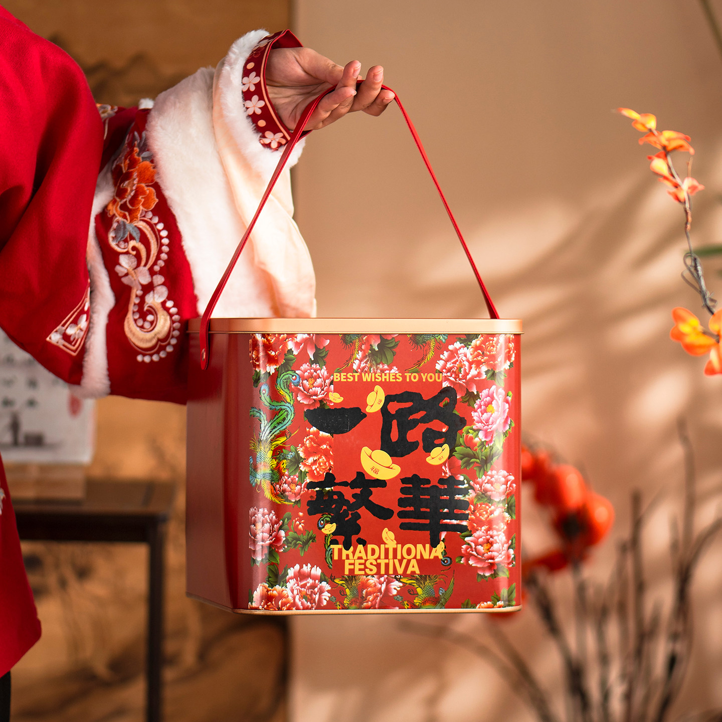 东北大花新年礼盒春节年货包装 盒空盒干坚果零食定制抱抱桶方铁盒
