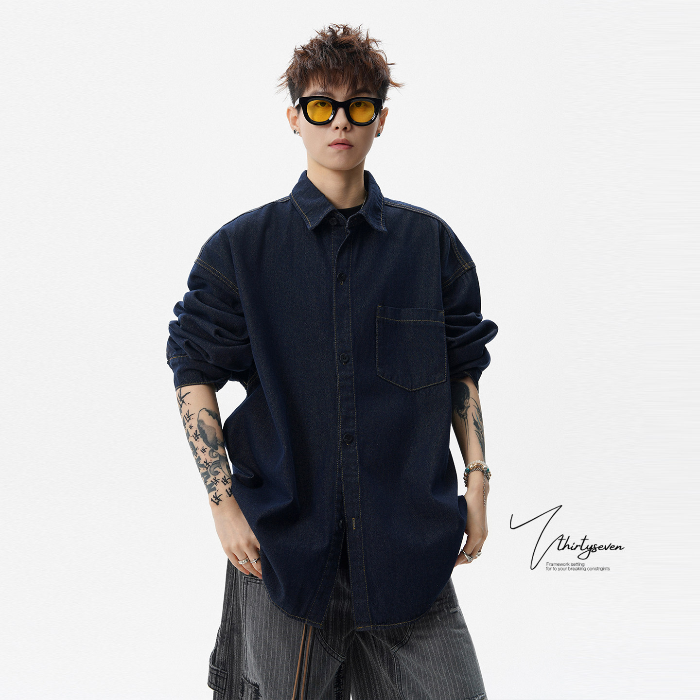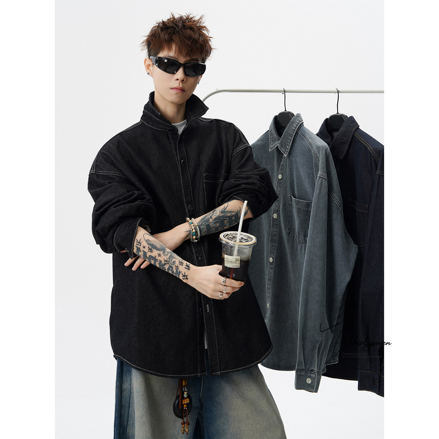 牛仔宽松深灰色衬衣 男潮流机车款 阿美咔叽全棉重水洗工装 牛仔衬衫