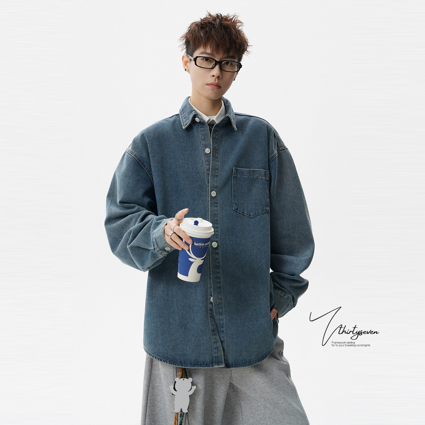 牛仔衬衫 复古单口袋工装 丹宁休闲长袖 修身 马登工装 衬衣男秋季 美式