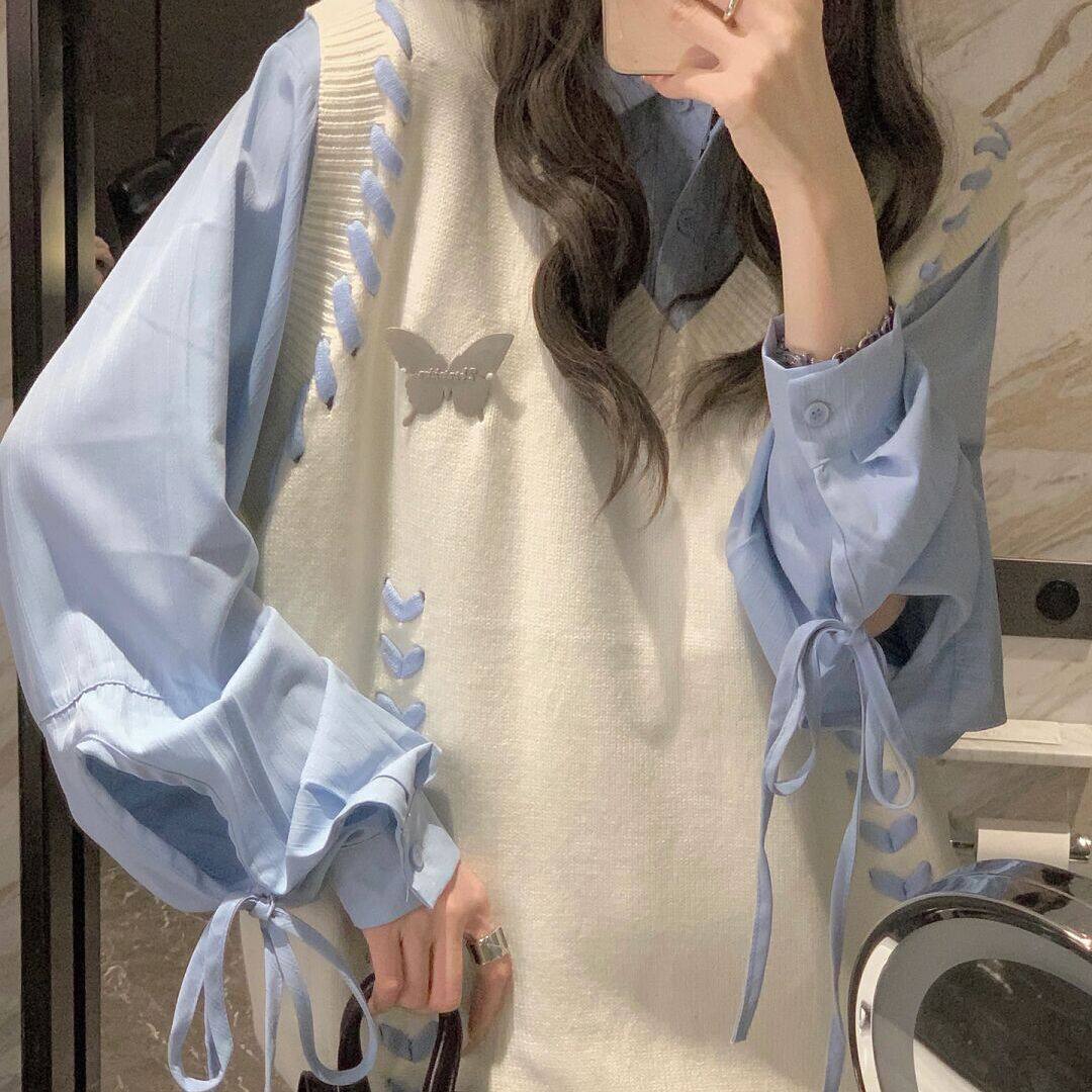 两件套装 女 学院风蝴蝶设计感绑带V领针织马甲背心毛衣女叠穿衬衫