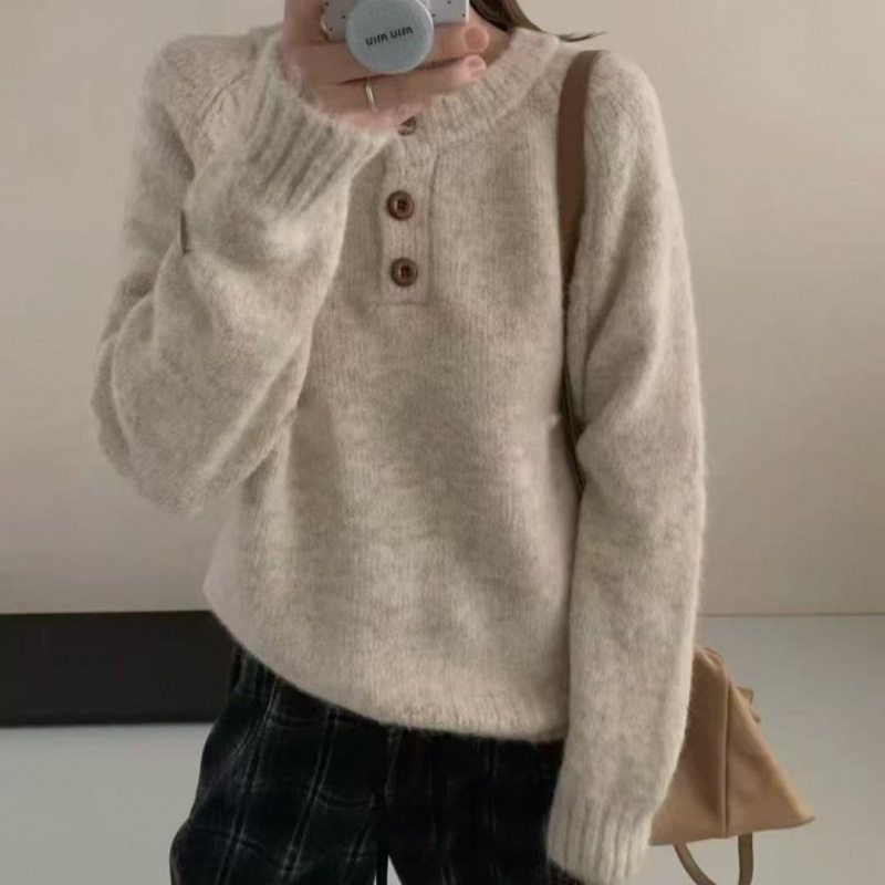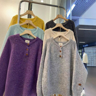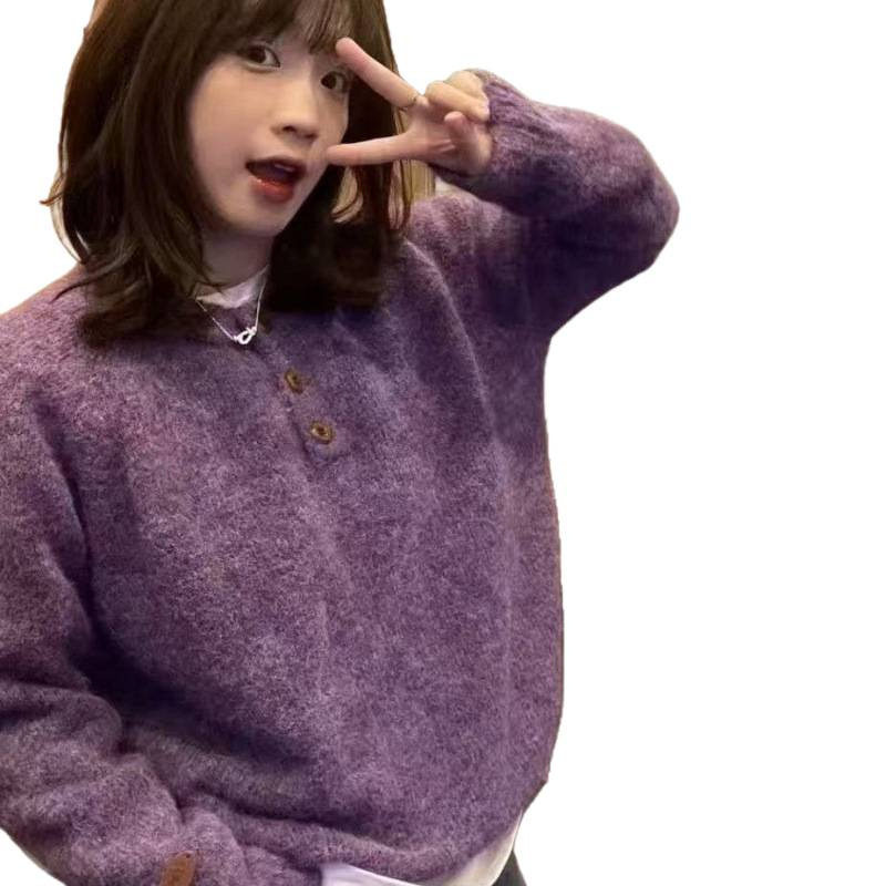 egg家紫色软糯圆领毛衣女秋冬百搭温柔风宽松外穿慵懒风针织衫