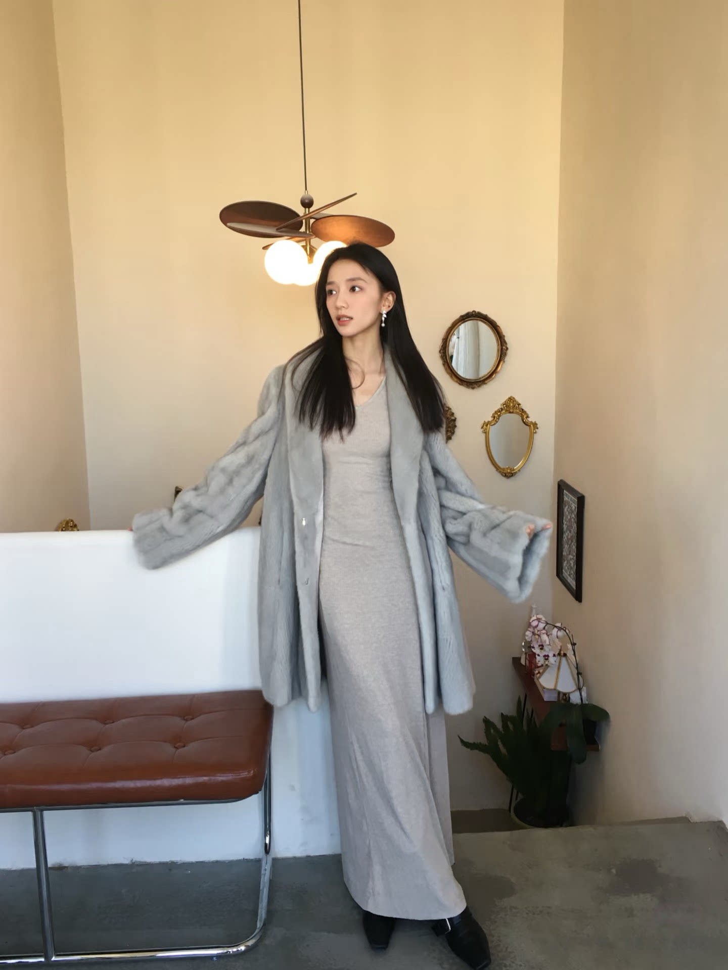 毛毛大衣 宽松保暖中长款 冬日序曲仿水貂毛皮草外套女秋冬新款 挽袖