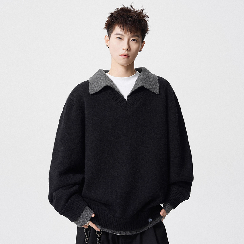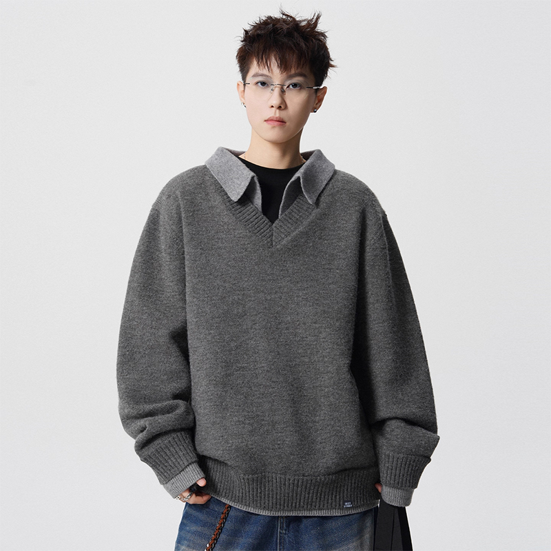 冬装 男士 翻领羊毛针织衫 衣服英伦雅痞男装 上衣 假两件灰色毛衣冬季