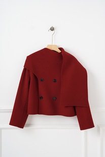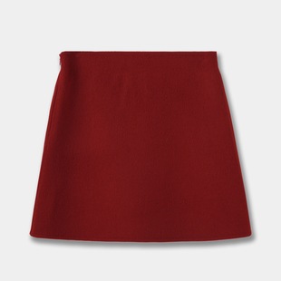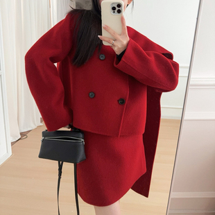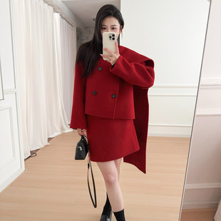 SW圣诞红绵羊毛围巾领短款 双面呢大衣a字半裙两件套女过年套裙冬