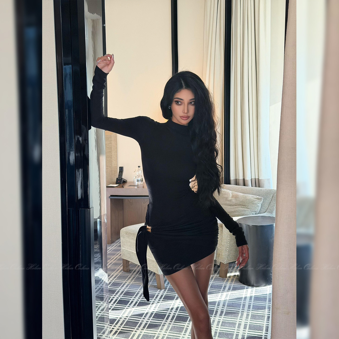 HELEN 显身材辣妹磨绒包臀裙显瘦褶皱半高领飘带连衣裙 微压塑形