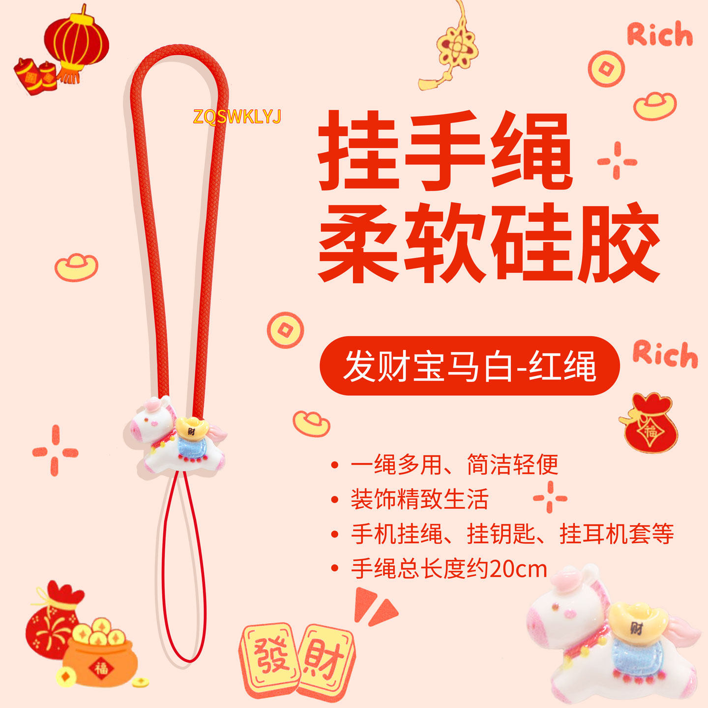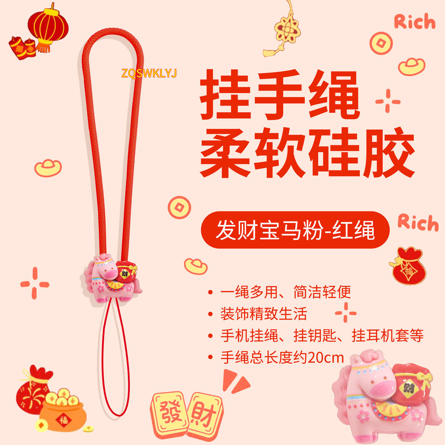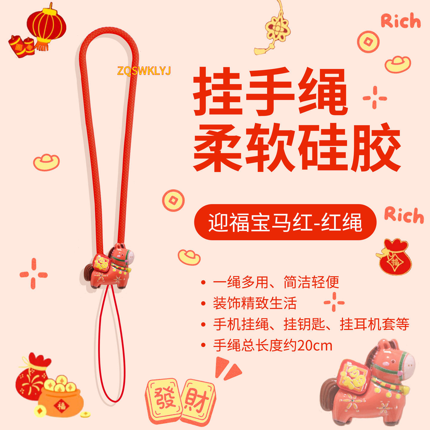 SFUN马年本命红新年小马手机挂绳硅胶短腕带耳机钥匙u盘挂件链饰