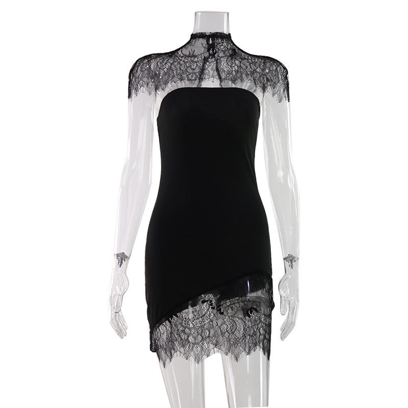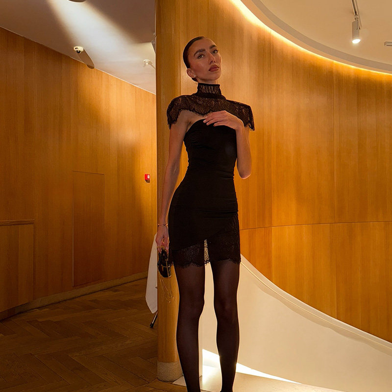 CNYISHE 两件套 欧美风辣妹黑色显瘦高级感连衣裙气质蕾丝高领小衫