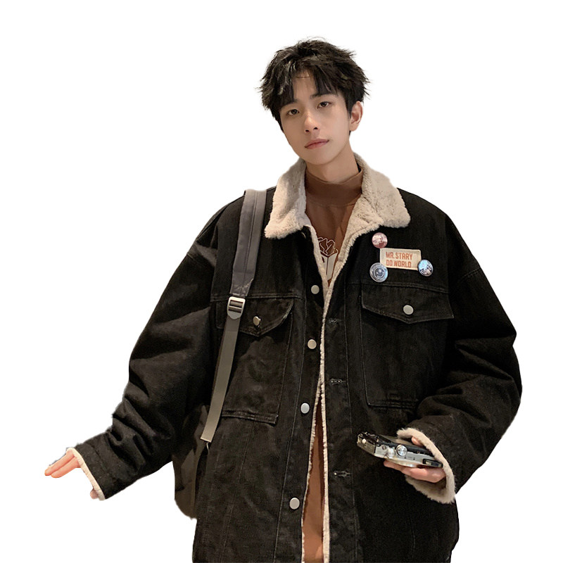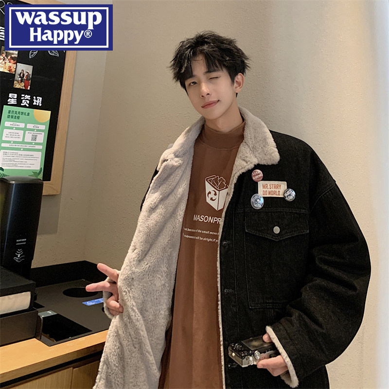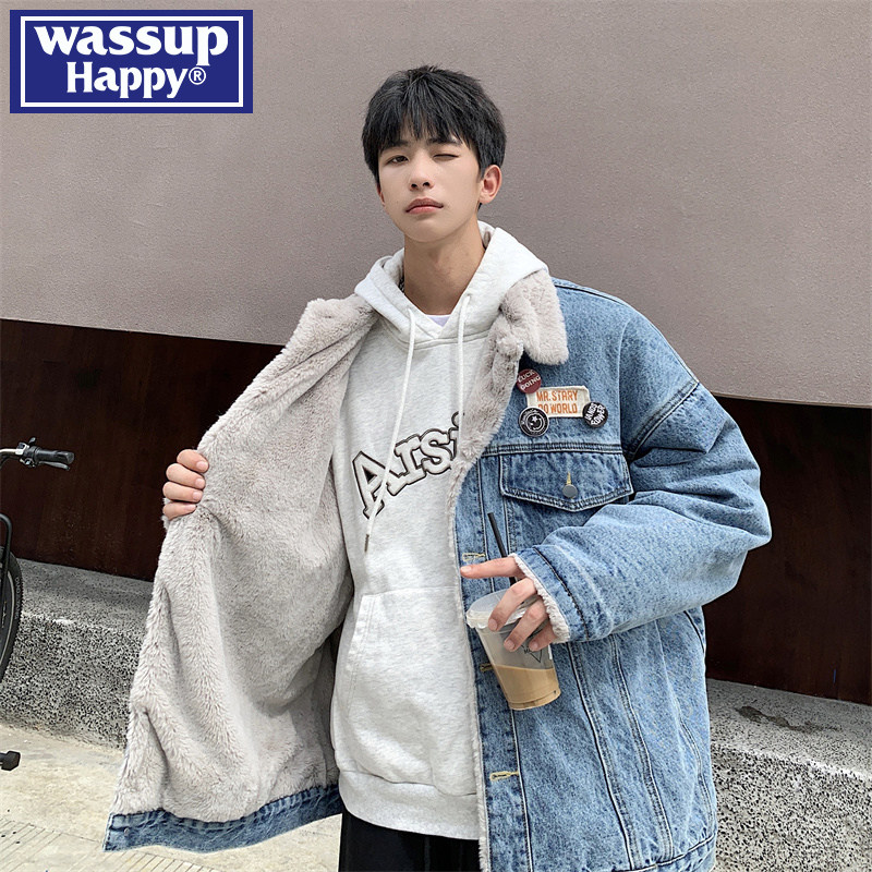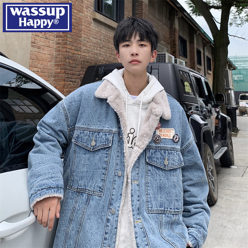 wassup 潮牌复古宽松休闲牛仔外套 happy翻领羊羔绒棉衣男冬季