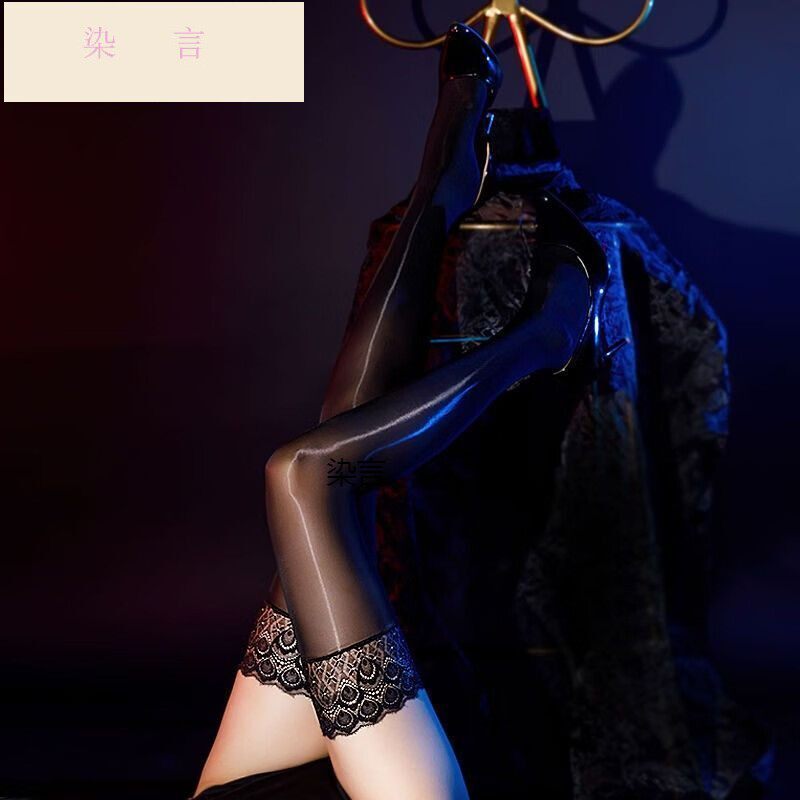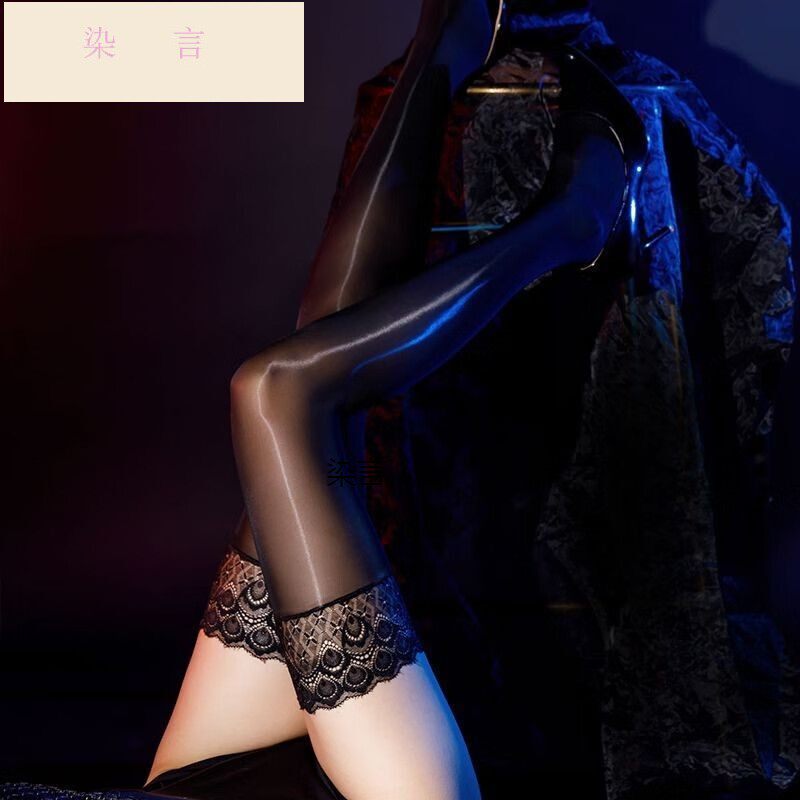 性感丝滑油光美腿丝袜孔雀蕾丝边长筒袜油亮超宽罗口矽胶防滑长筒