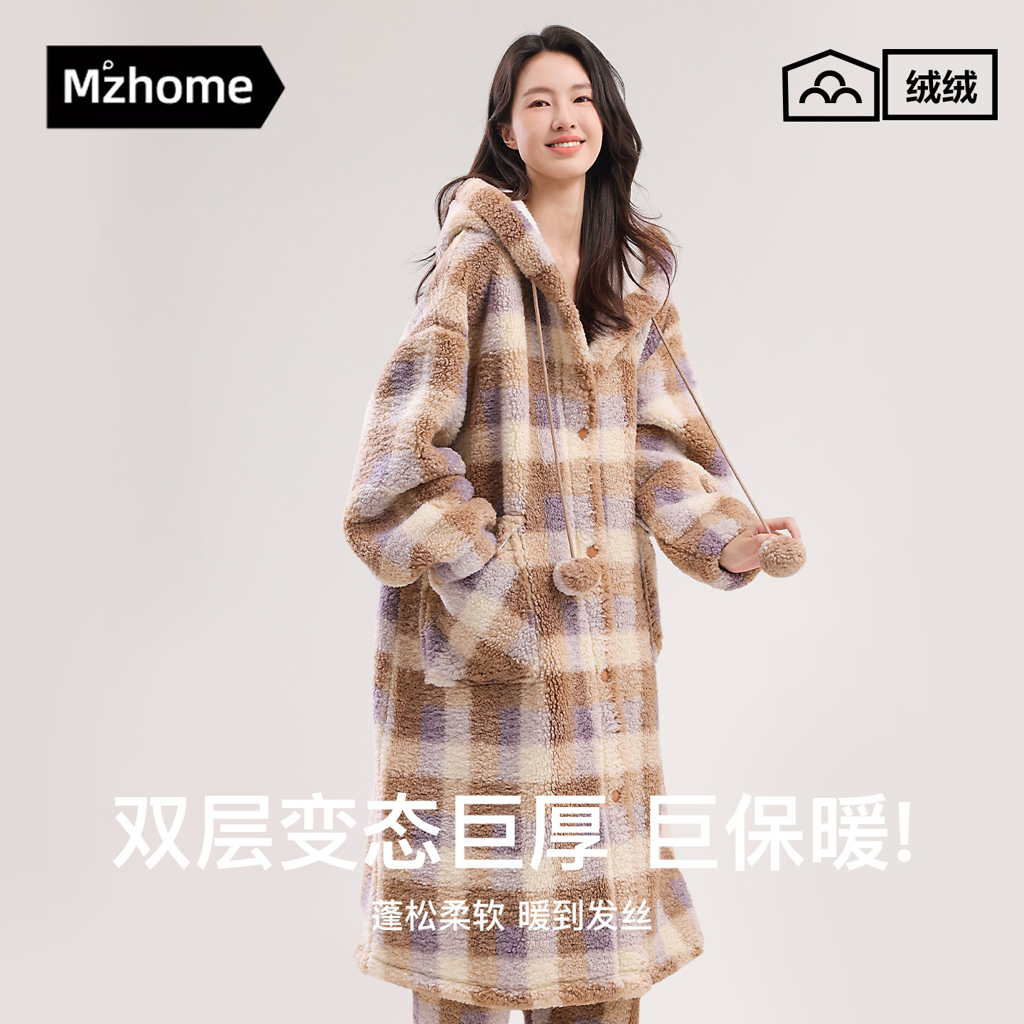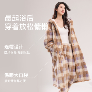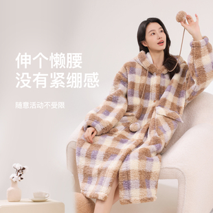 睡衣秋冬款 双层加厚珊瑚绒连帽格子长款 家居服 睡袍女冬季 巨巨厚