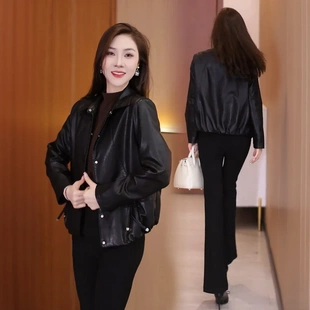 皮衣外套女宽松中长款 上衣女士皮夹克 春秋设计感PU皮机车夹克长袖