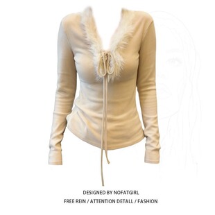 大码 上衣 胖MM纯欲风V领系带毛领T恤女2026春秋磨毛气质绝美打底衫