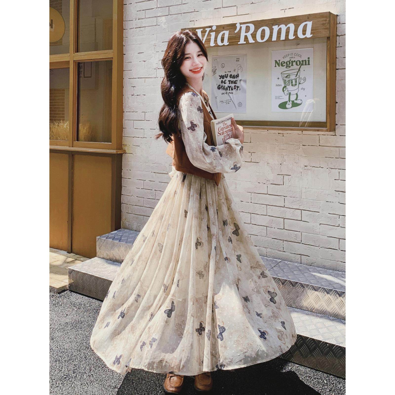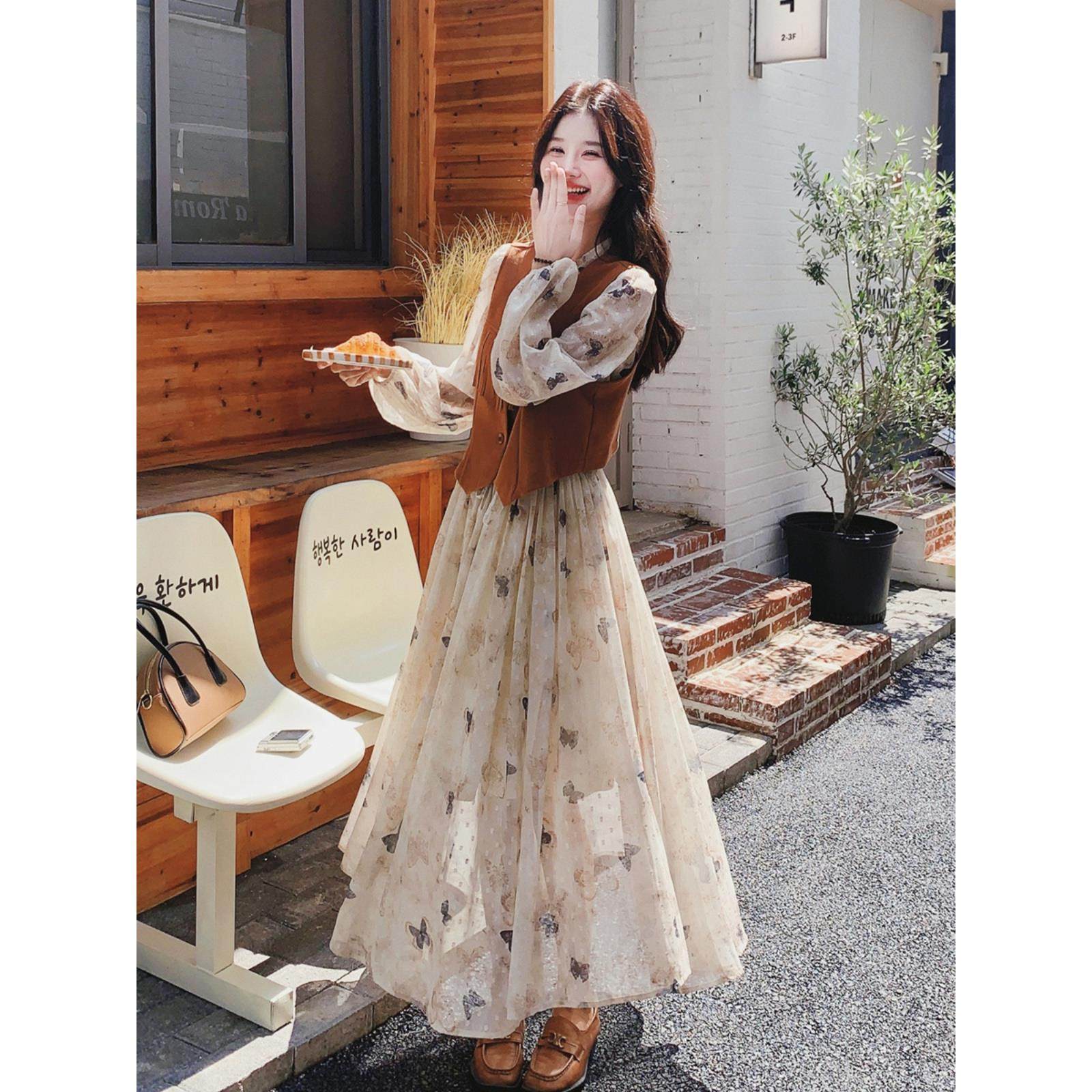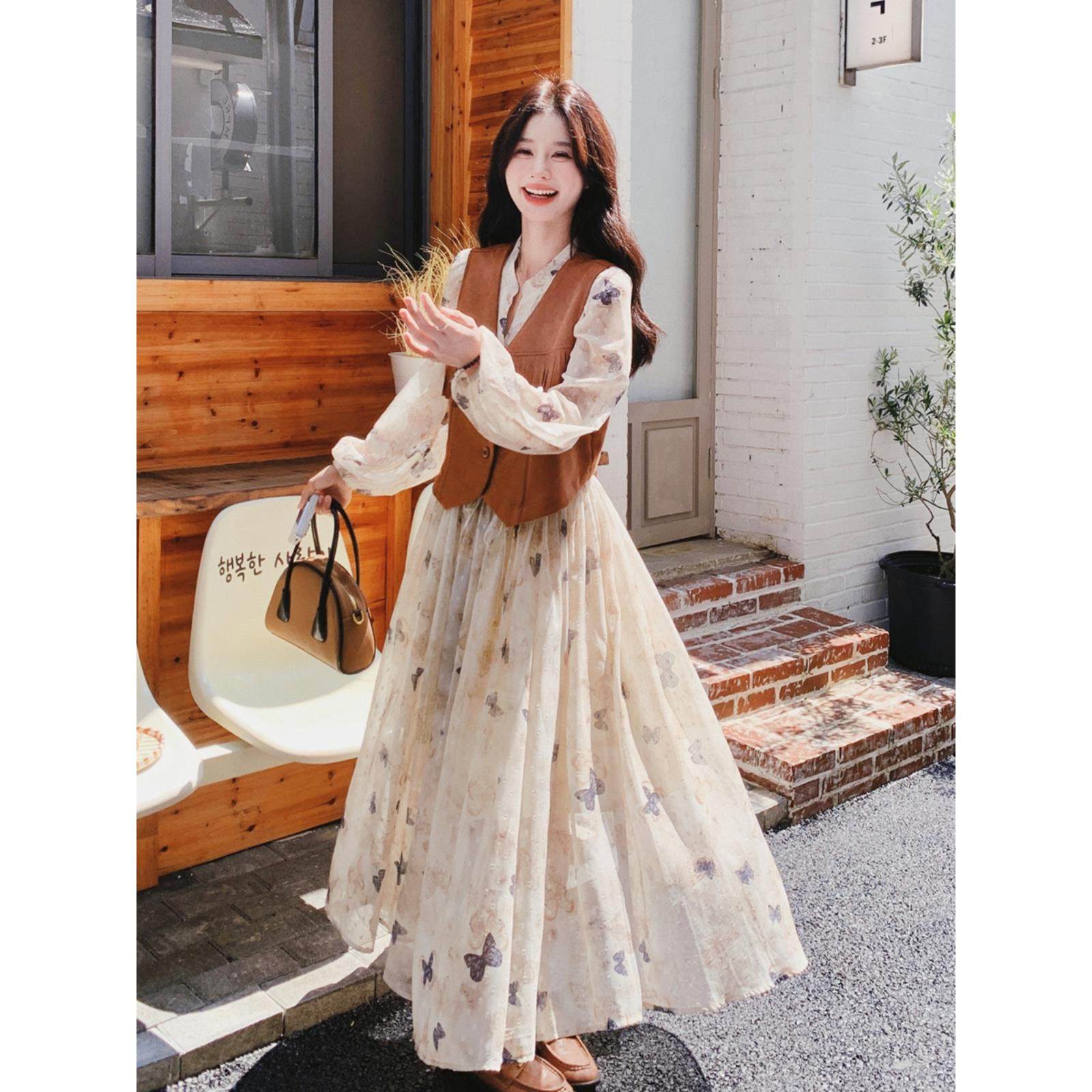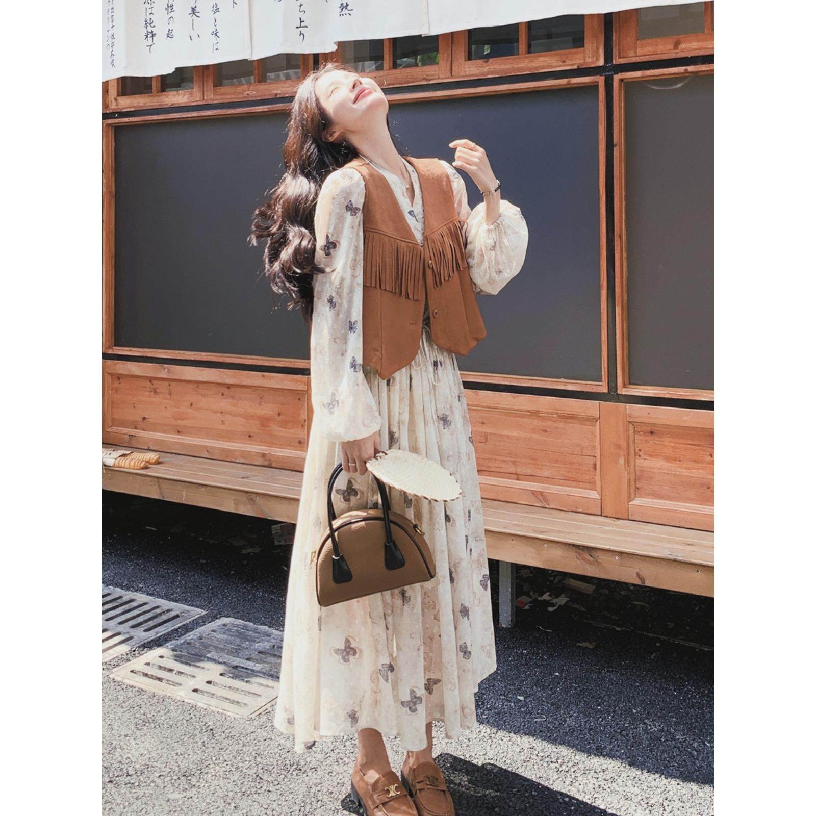 麂皮绒马甲碎花裙套装 高级感气质显瘦长裙两件套潮 春秋女2025新款