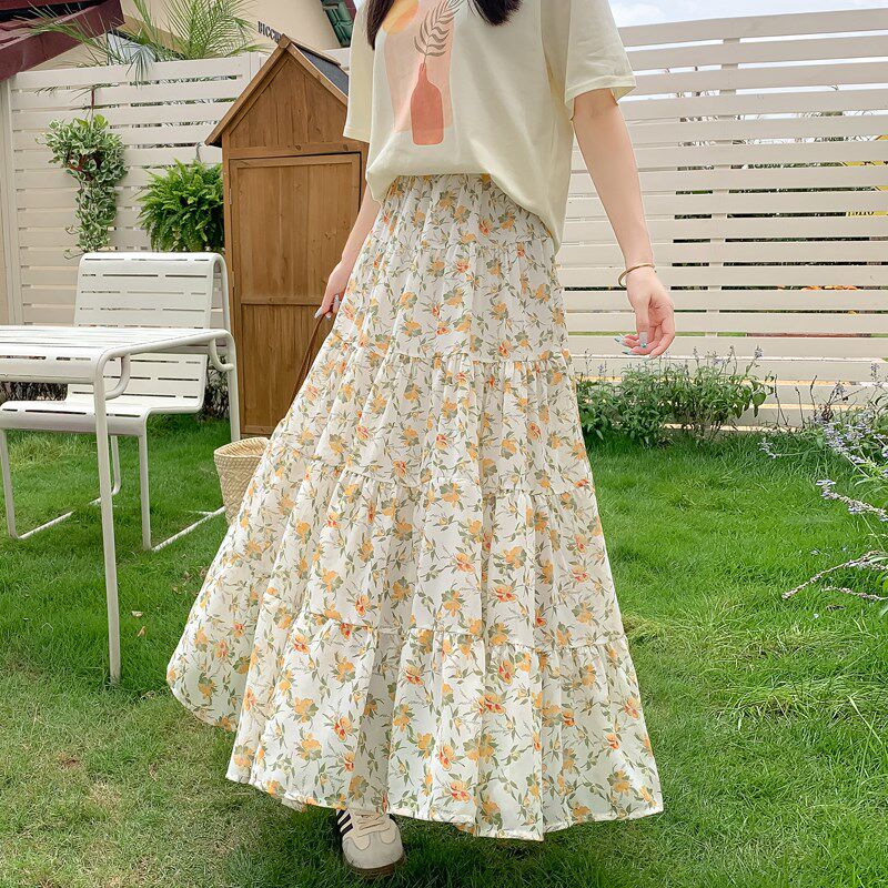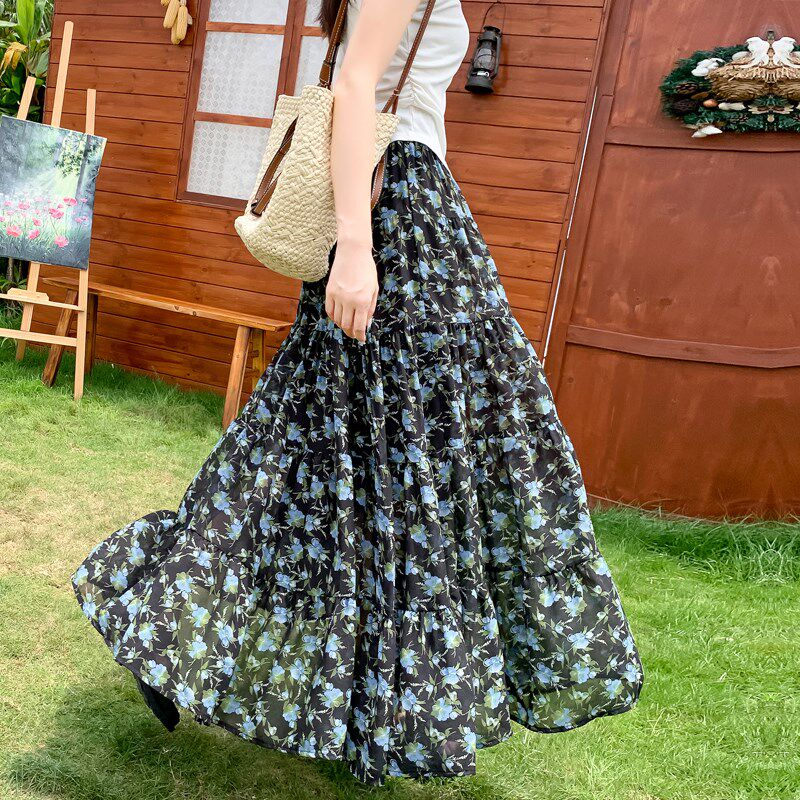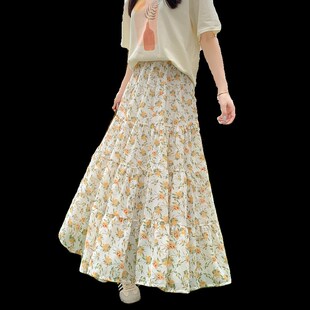 宽松大摆蛋糕a字长裙高腰碎花 2025新D款 新品 飘逸雪纺半身裙女夏季