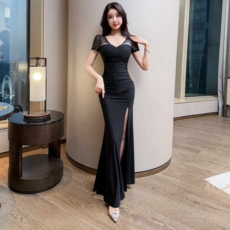 2026年桑拿洗浴中心技师上班柔式 显瘦酒吧小姐黑色长裙 连衣裙修身