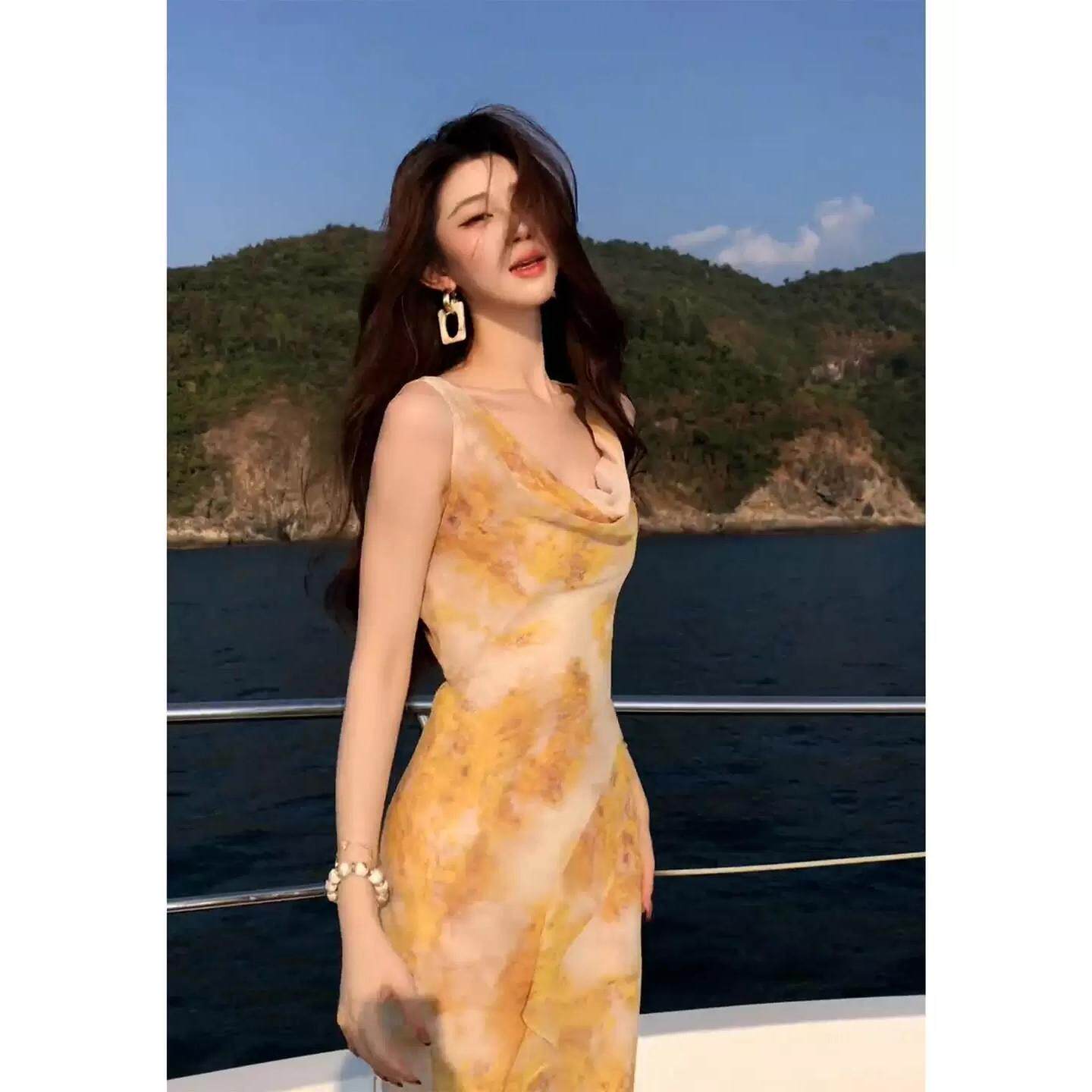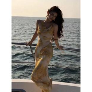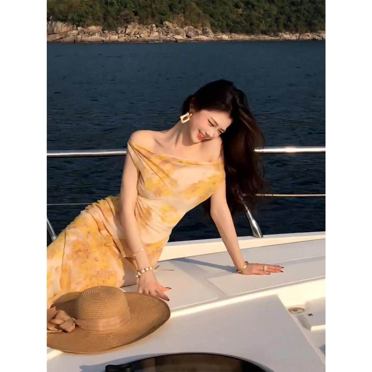 新款 连衣裙女2026夏季 度假风长裙气质收腰裙子 性感一字肩短袖 法式