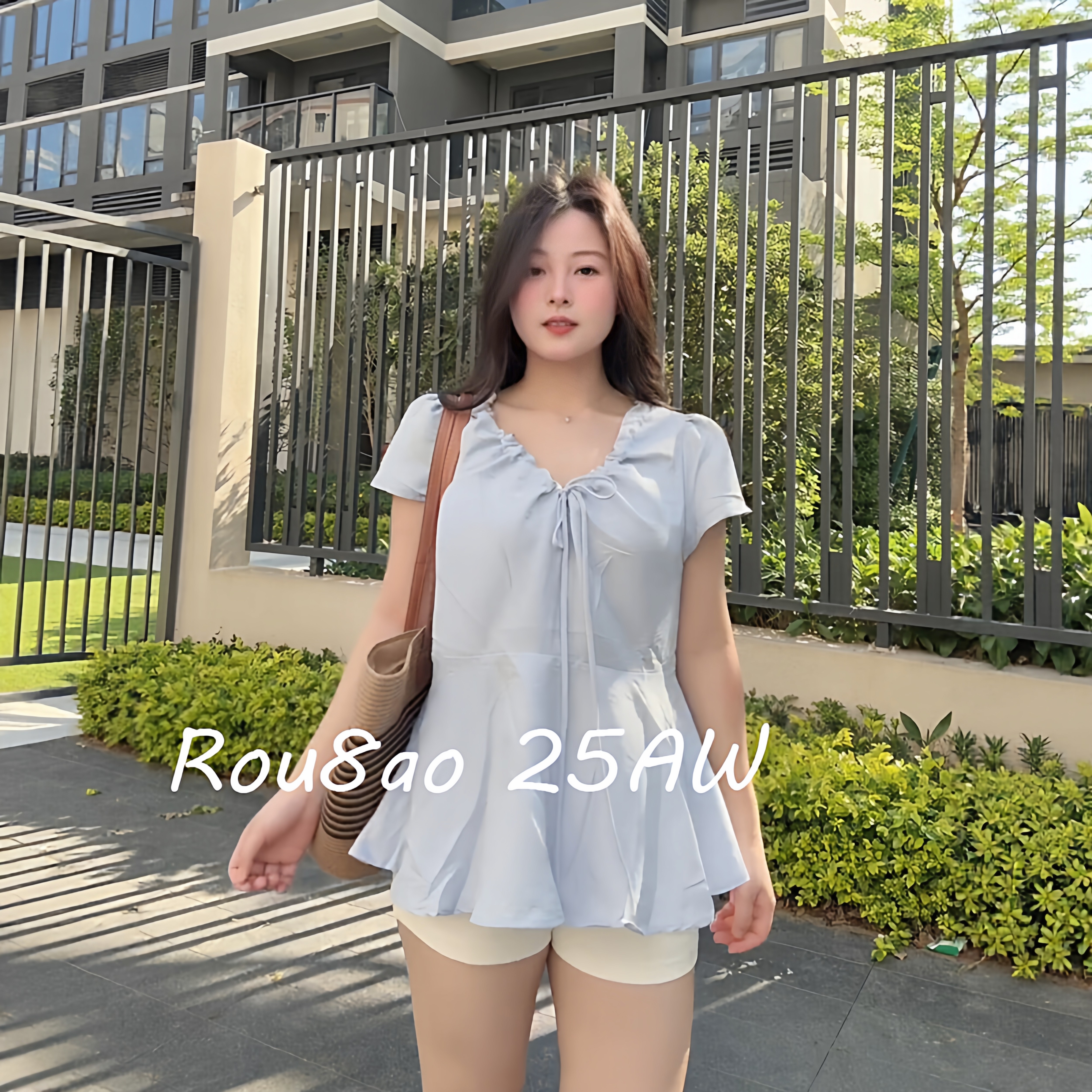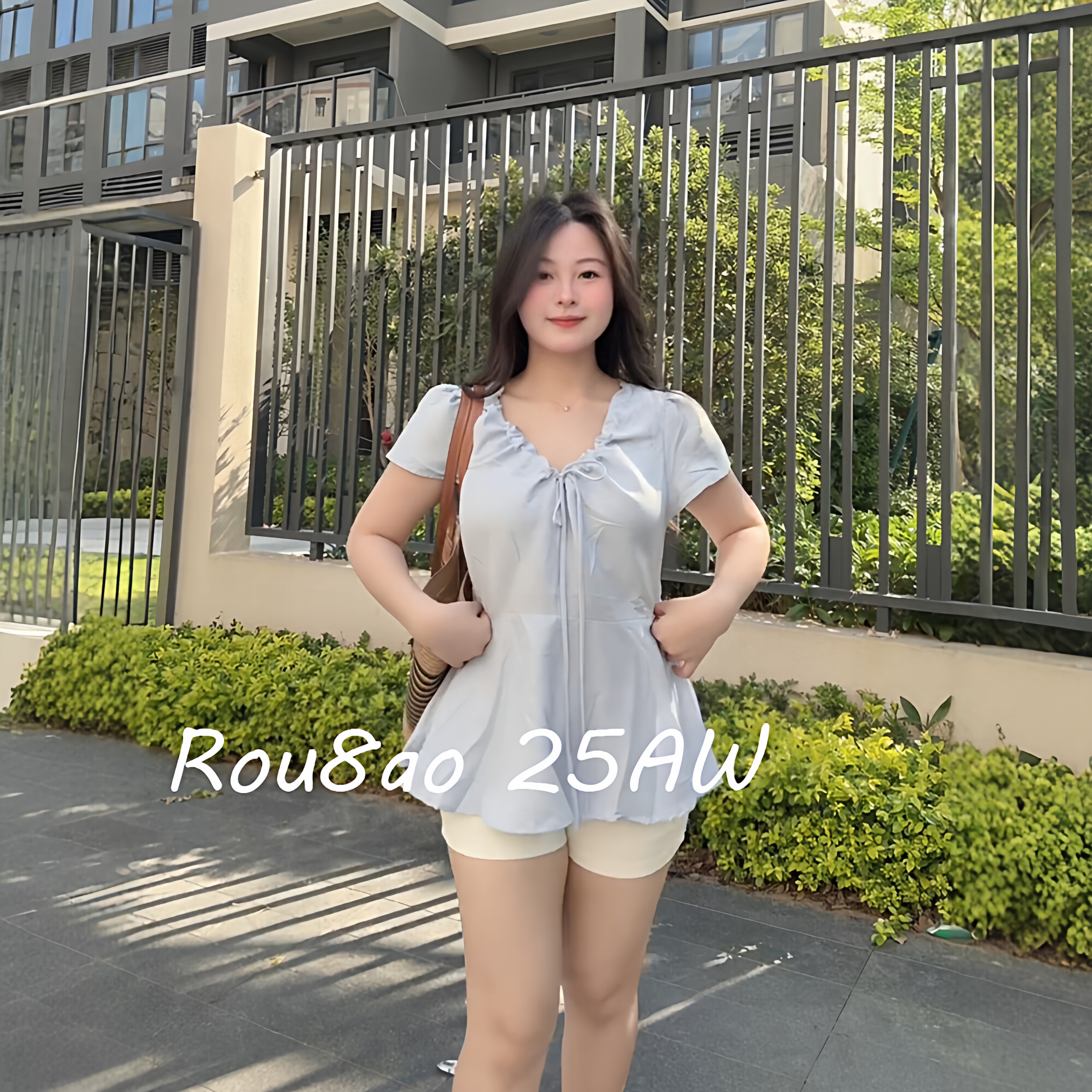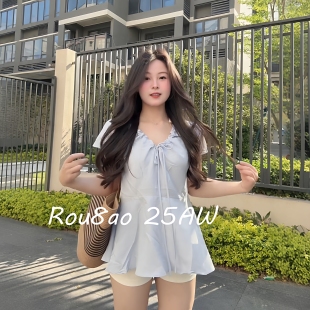 衬衫 韩系V领抽绳短袖 2026夏胖mm宽松显瘦上衣 女装 Rou8ao微胖大码