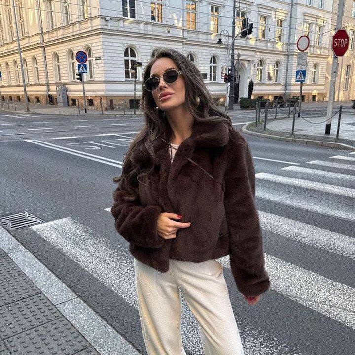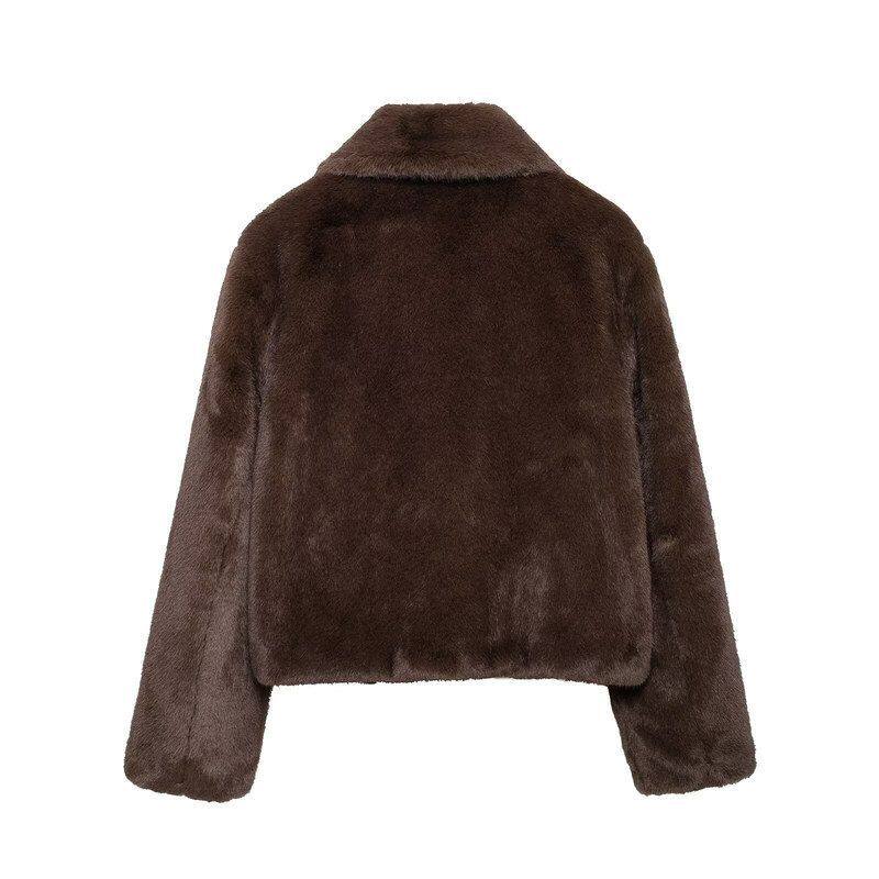 跨境欧美女装 复古人造皮草效果翻领宽松百搭休闲夹克大衣外套 新款