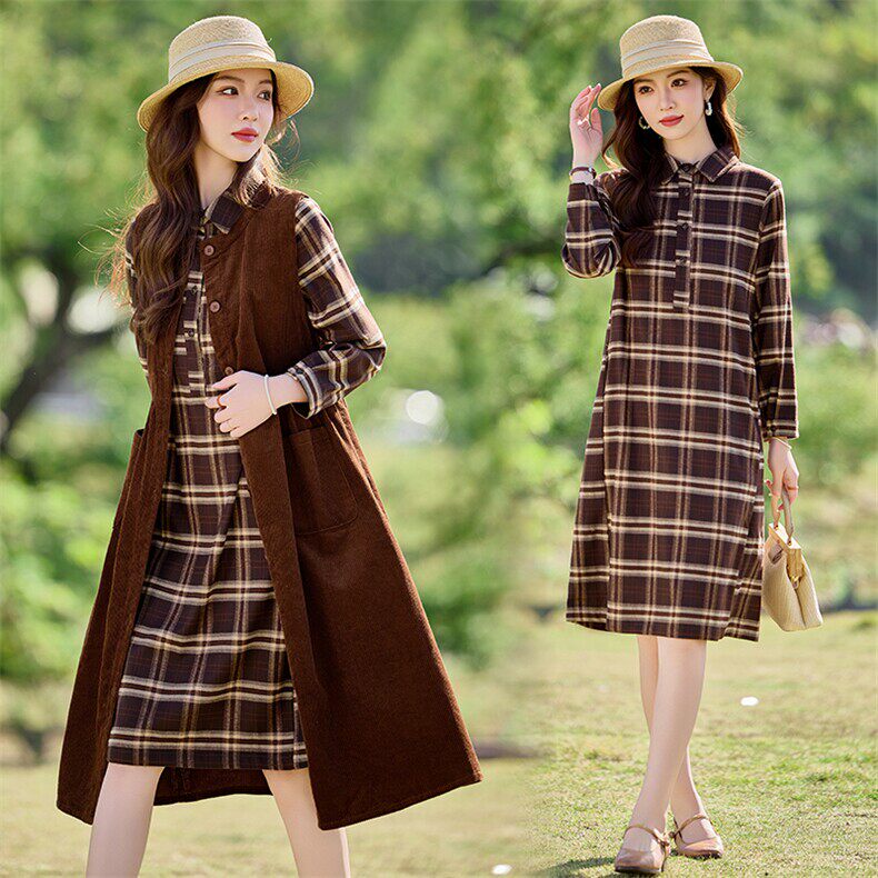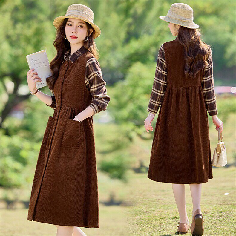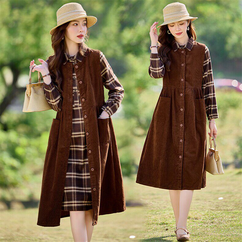 复古风灯芯绒格子两件套女春季 气质背心裙减龄套装
