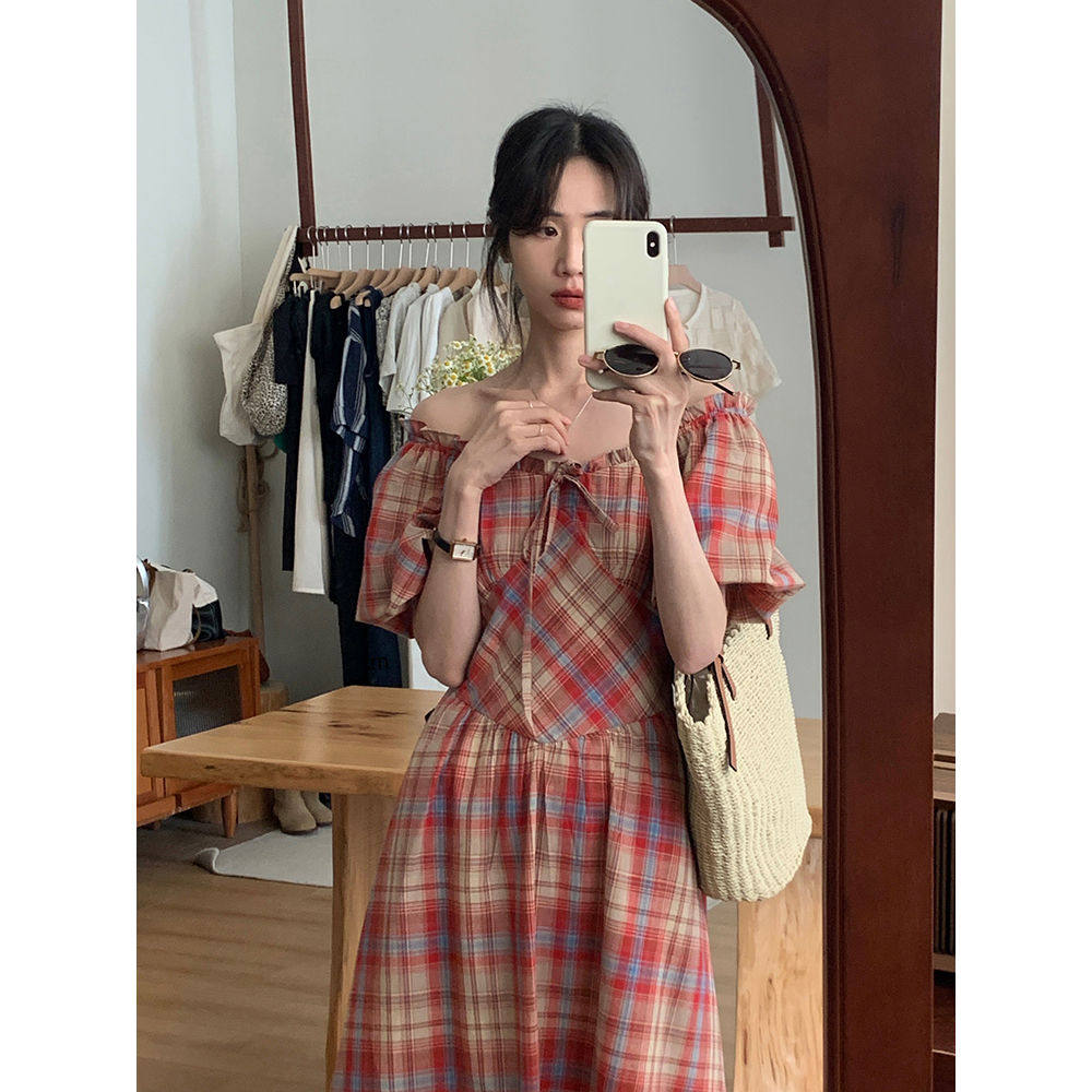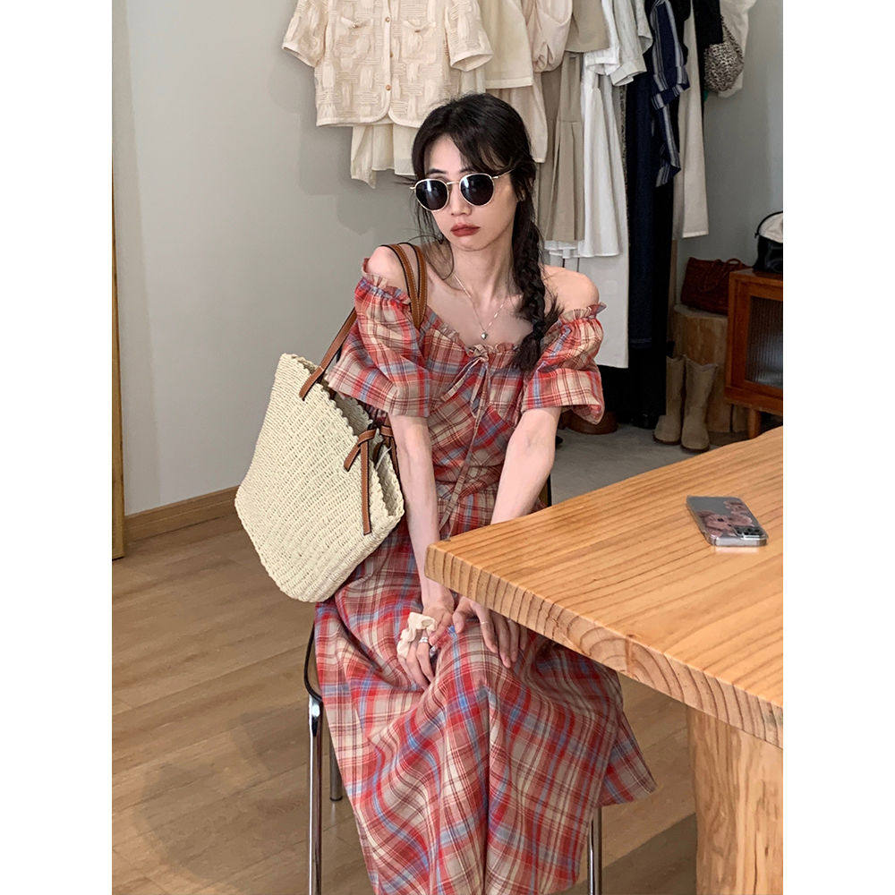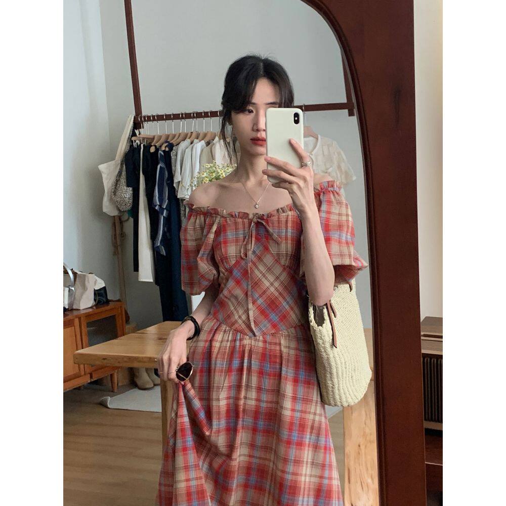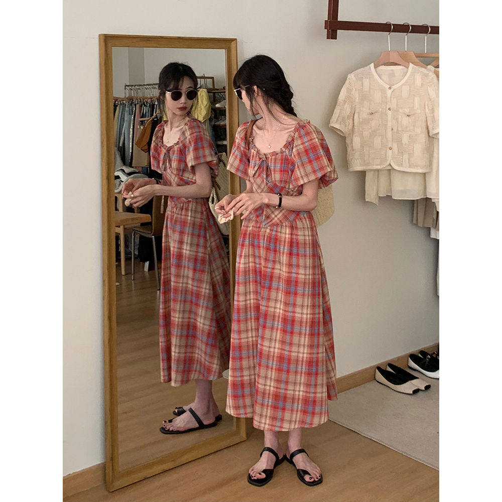 韩系复古方领格子收腰显瘦连衣裙女夏季 设计感小众长裙子 新款