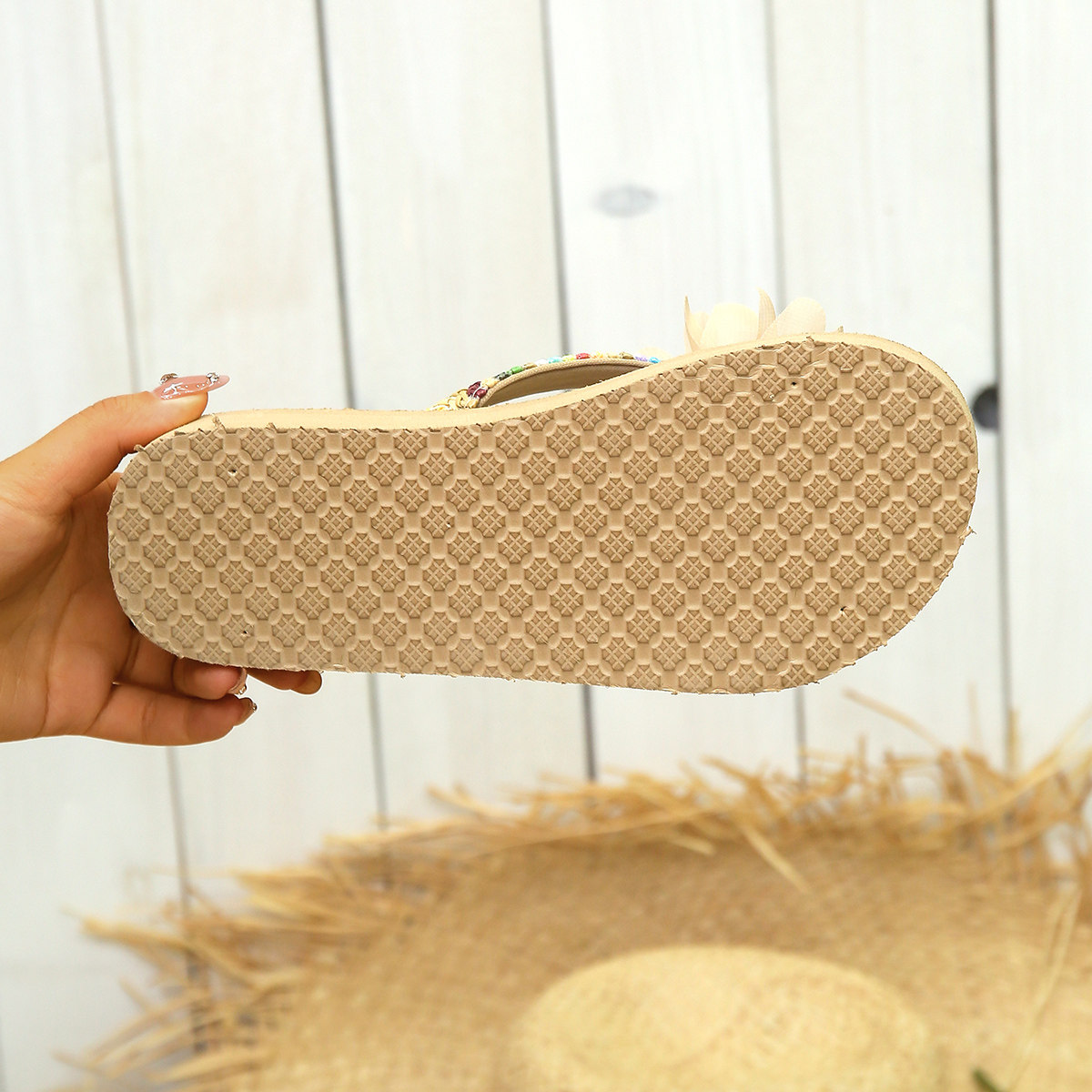 仙女风人字拖女夏季 凉鞋 时尚 海边沙滩鞋 草编花朵厚底鞋 新款