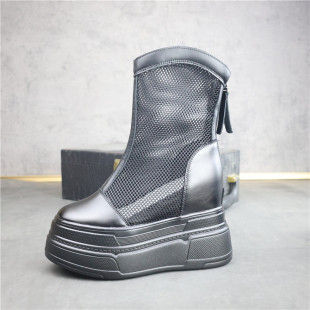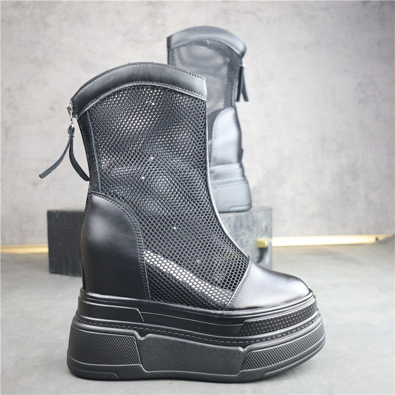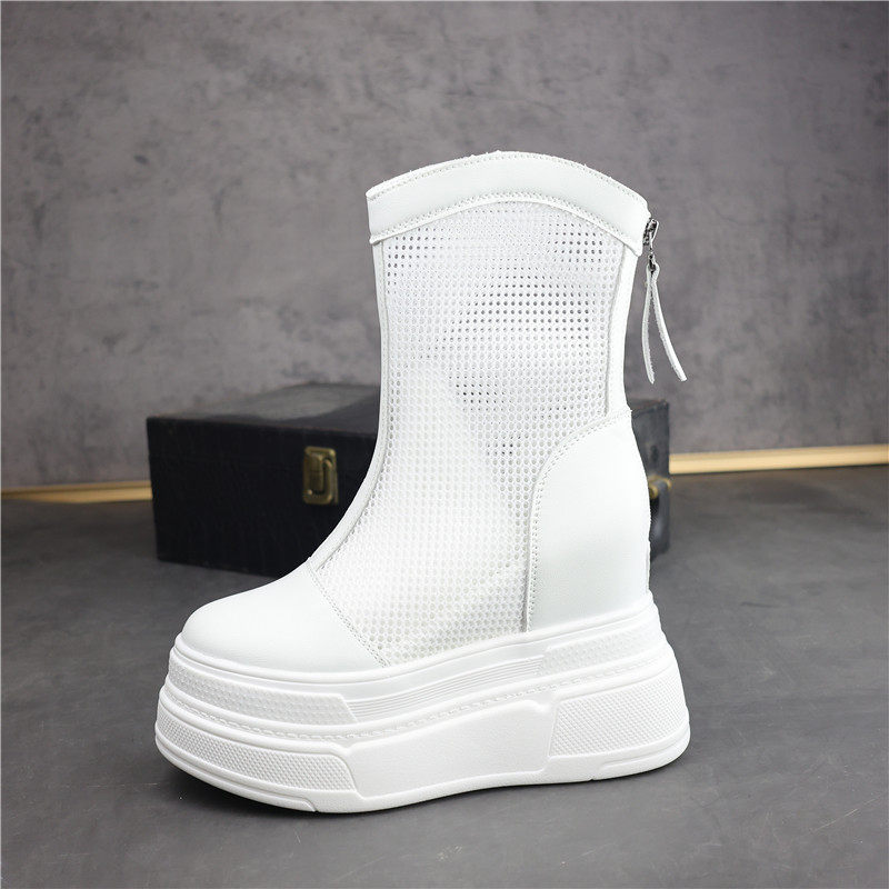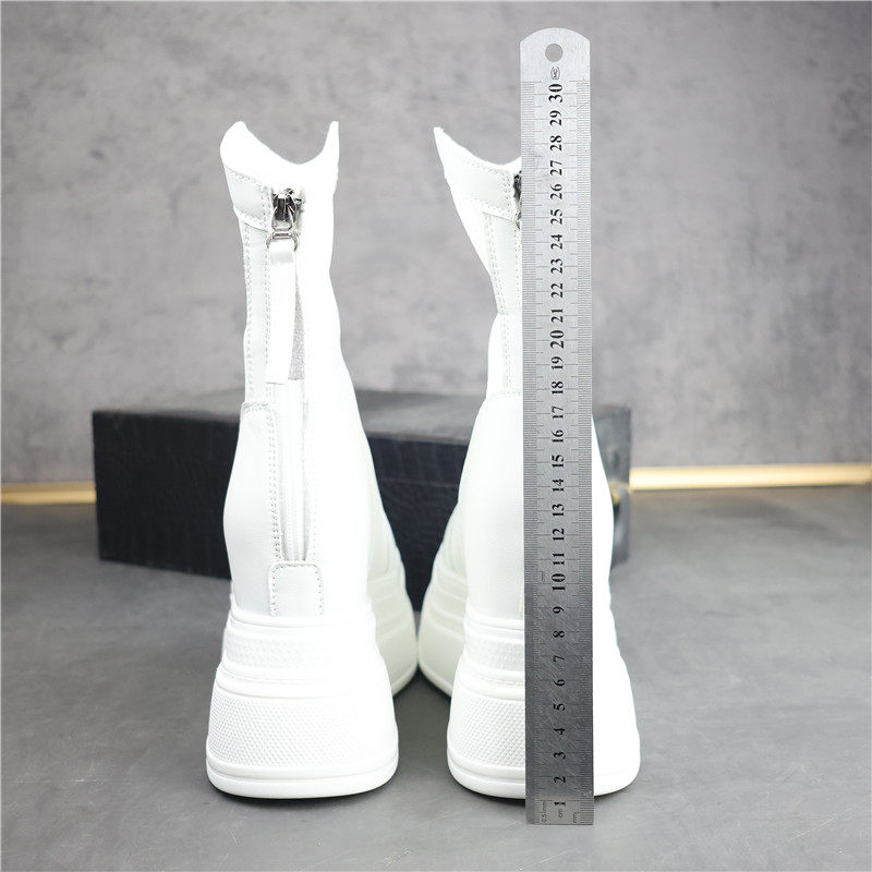 白色网面厚底高帮鞋 后拉链马丁靴瘦瘦靴 女小个子内增高15CM小白鞋