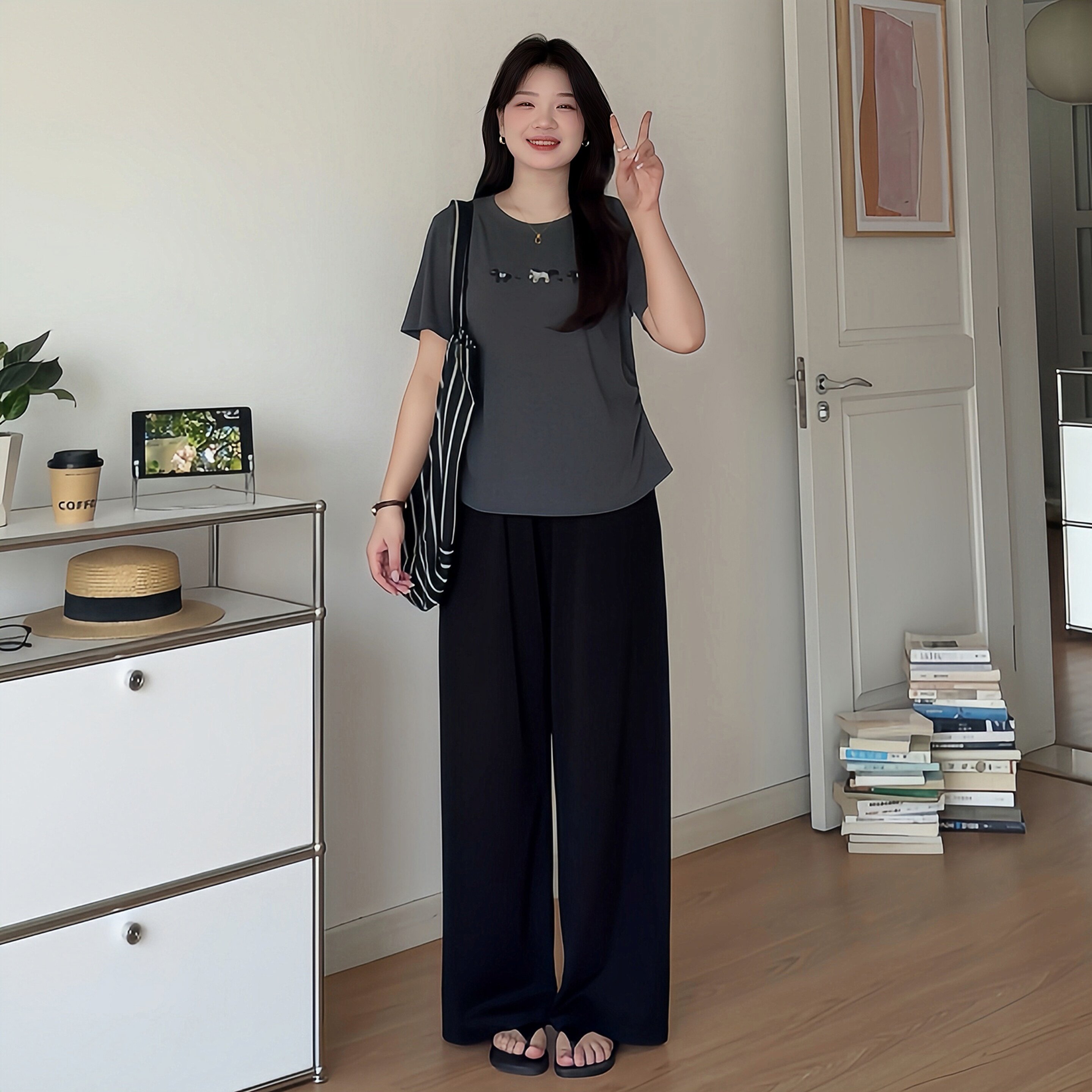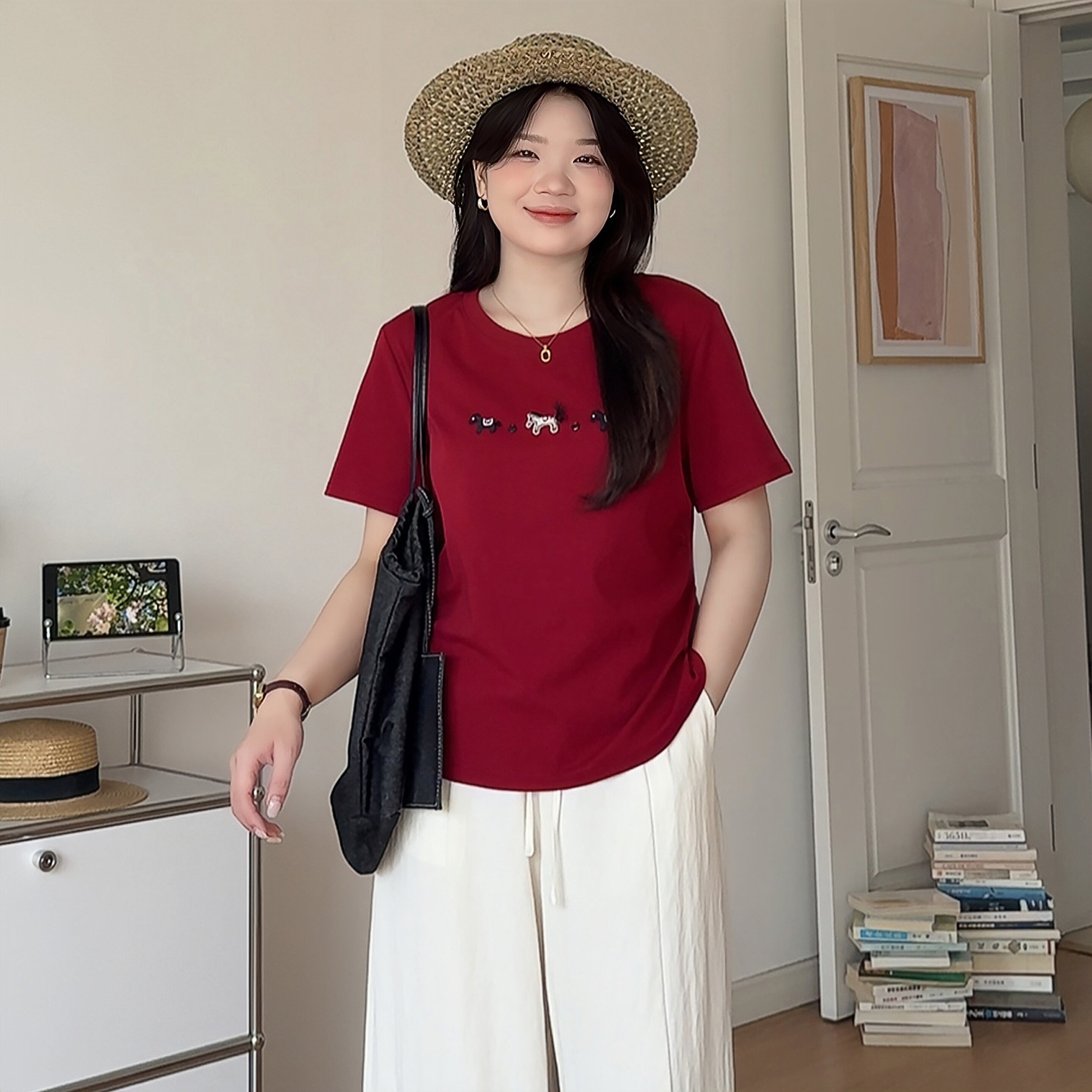 收腰捏褶设计感小马正肩上衣短袖 胖mm夏装 T恤3717 喵喵大码 微胖