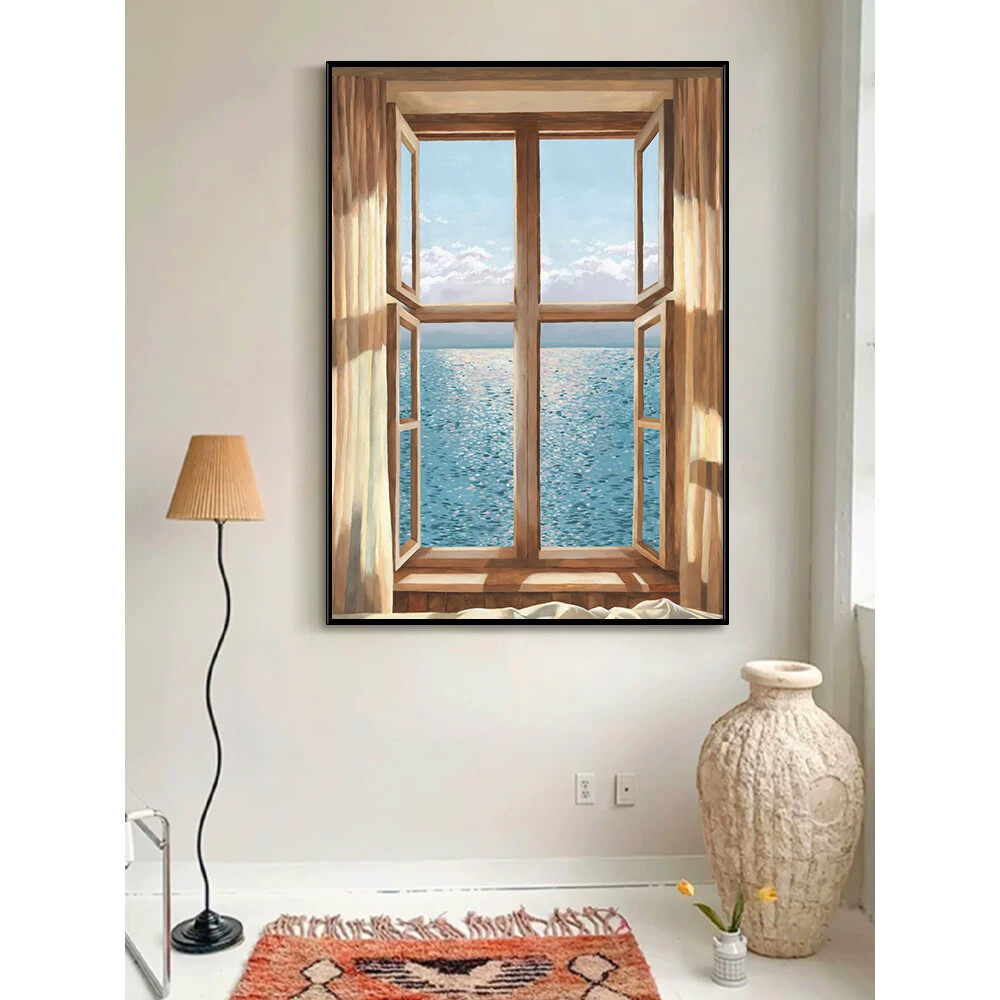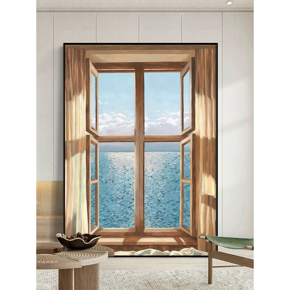 饰画玄关美式 现代简约装 高级感纯手绘油画客厅小众挂画 假窗户