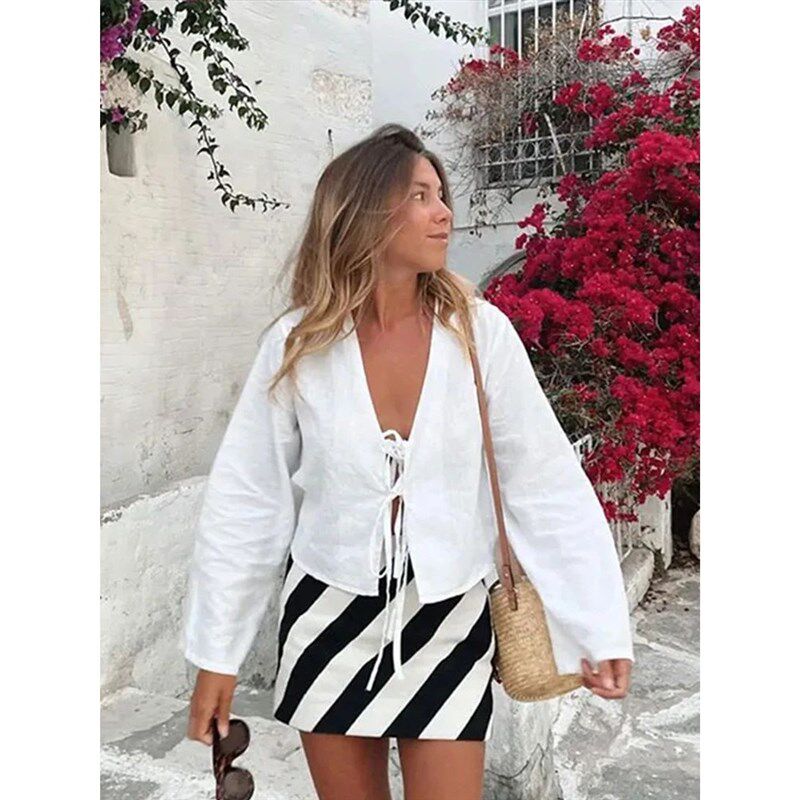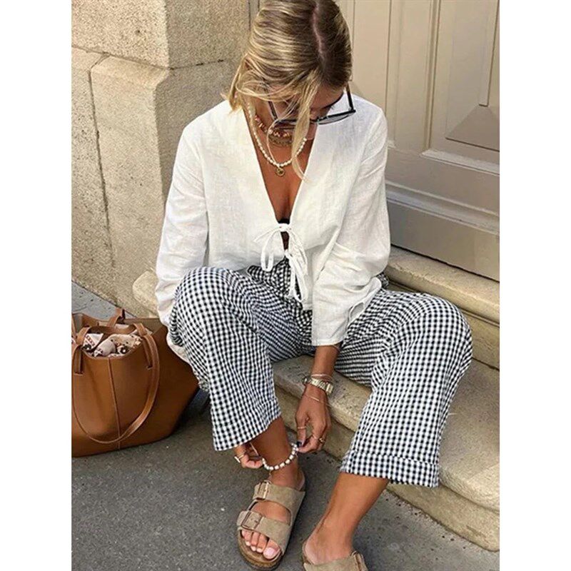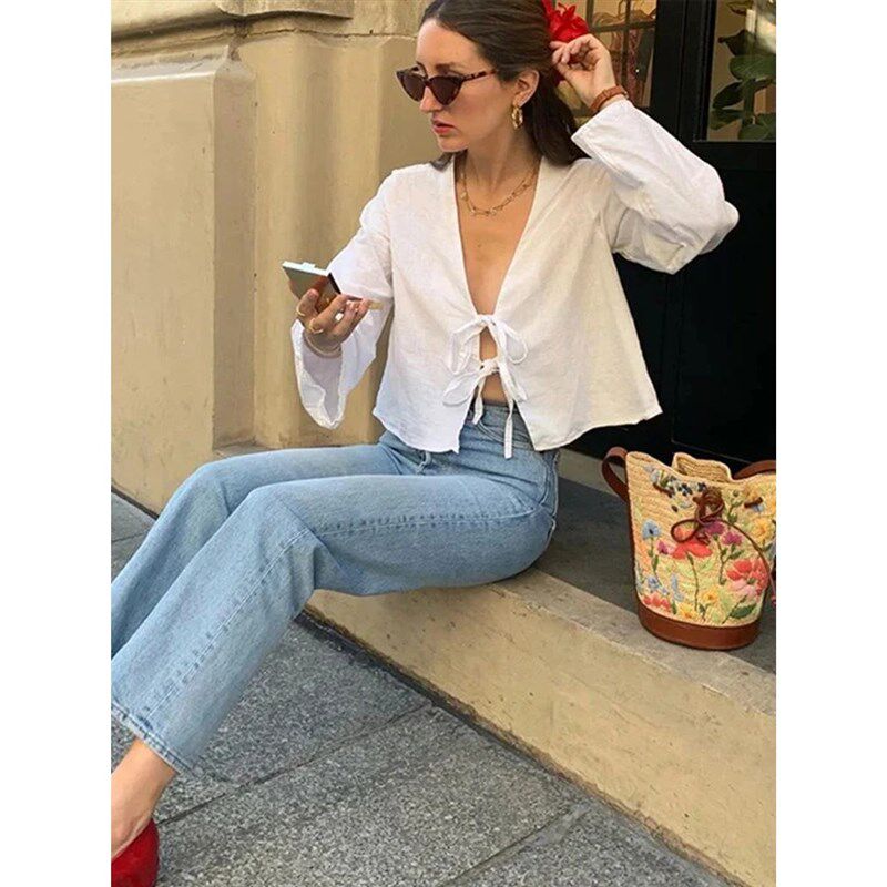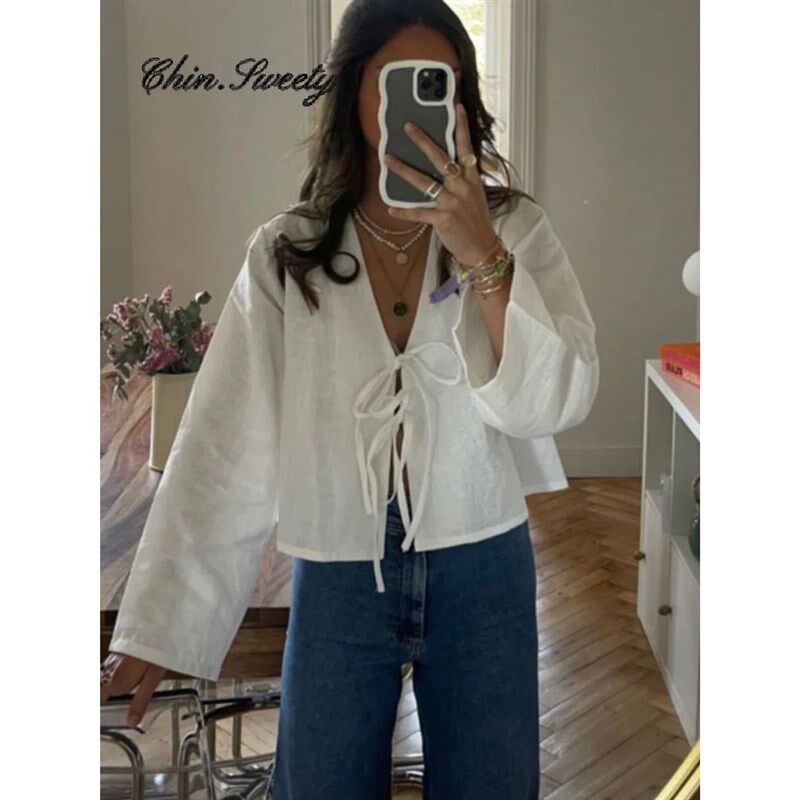 Sleeve Bow Casual Long Women Shirts Solid Flare Lace